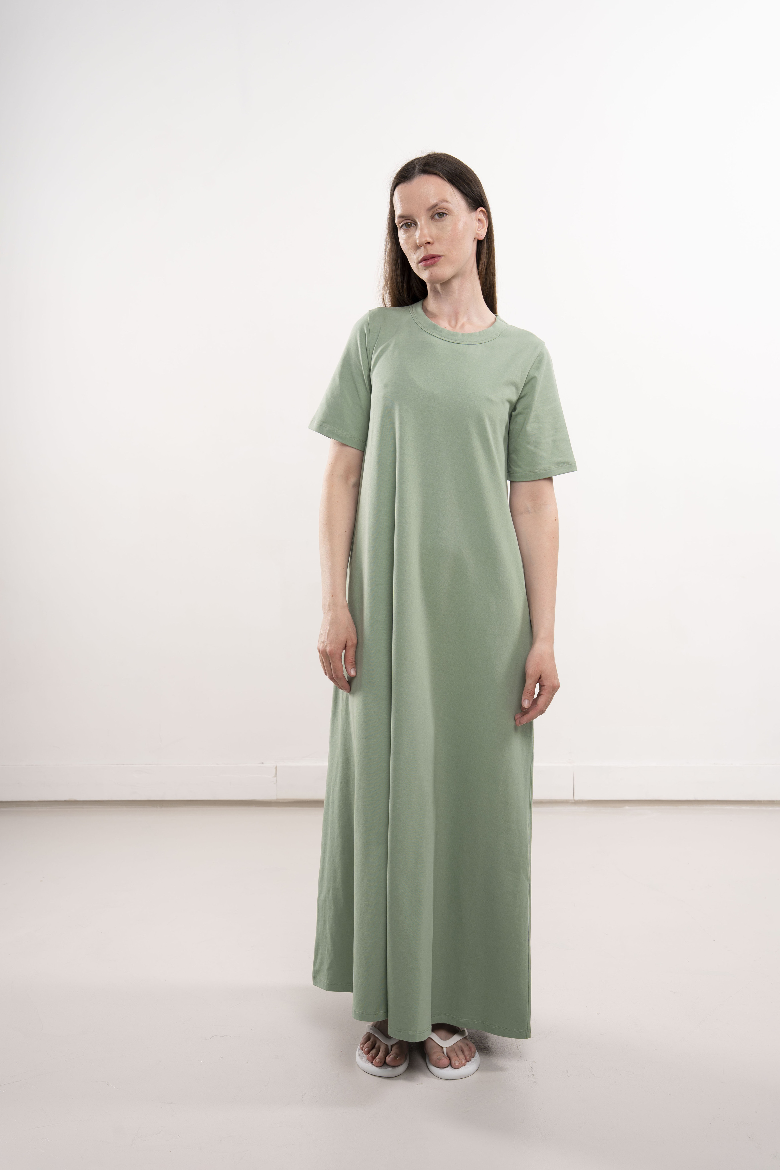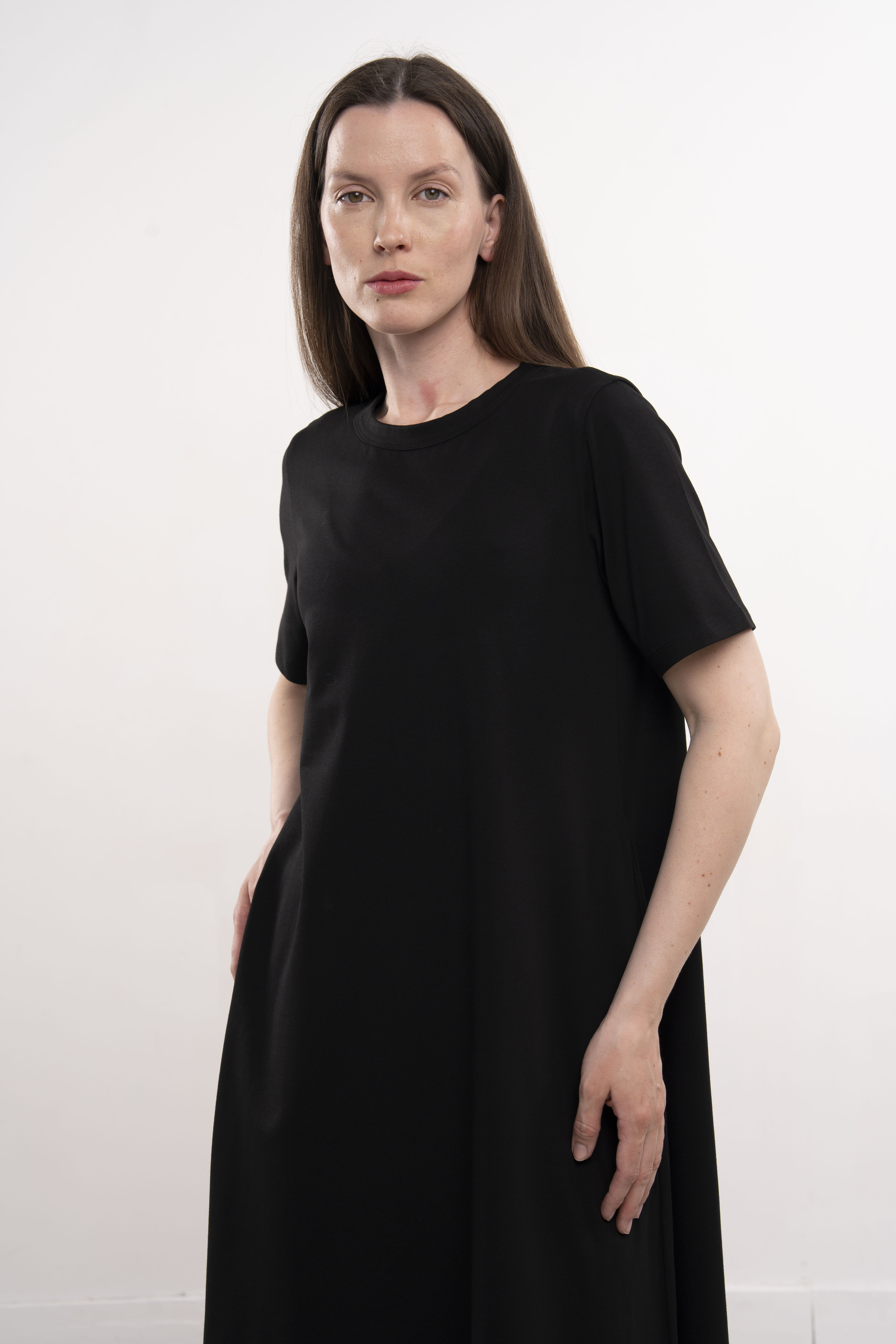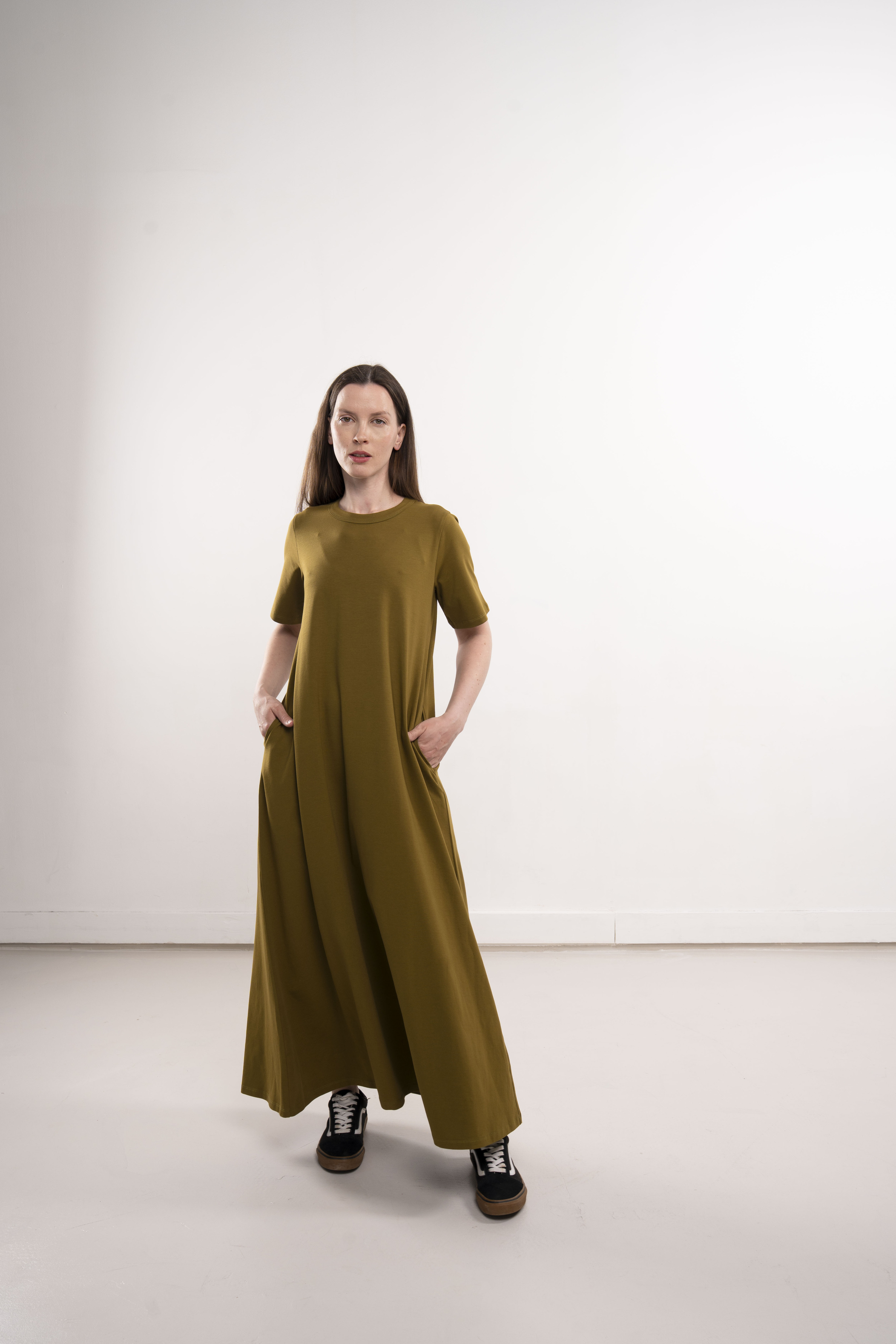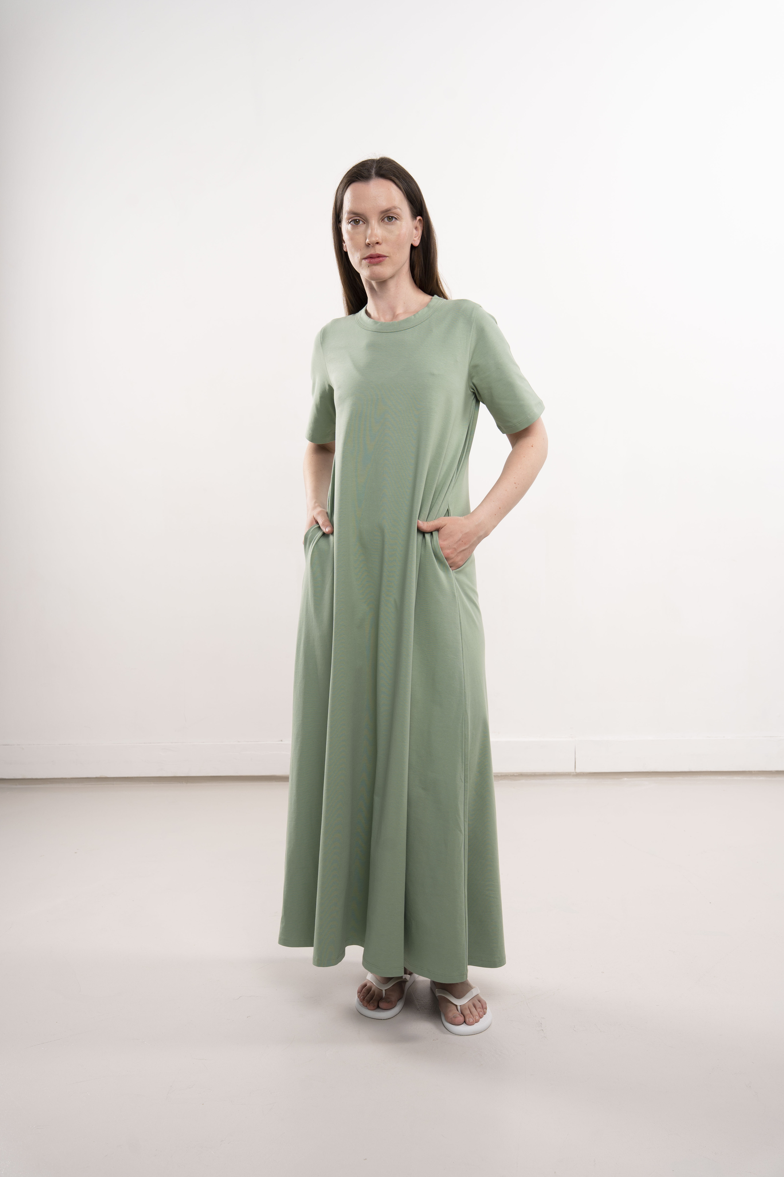Платье с короткими рукавами и карманами из хлопкового трикотажа пенье.