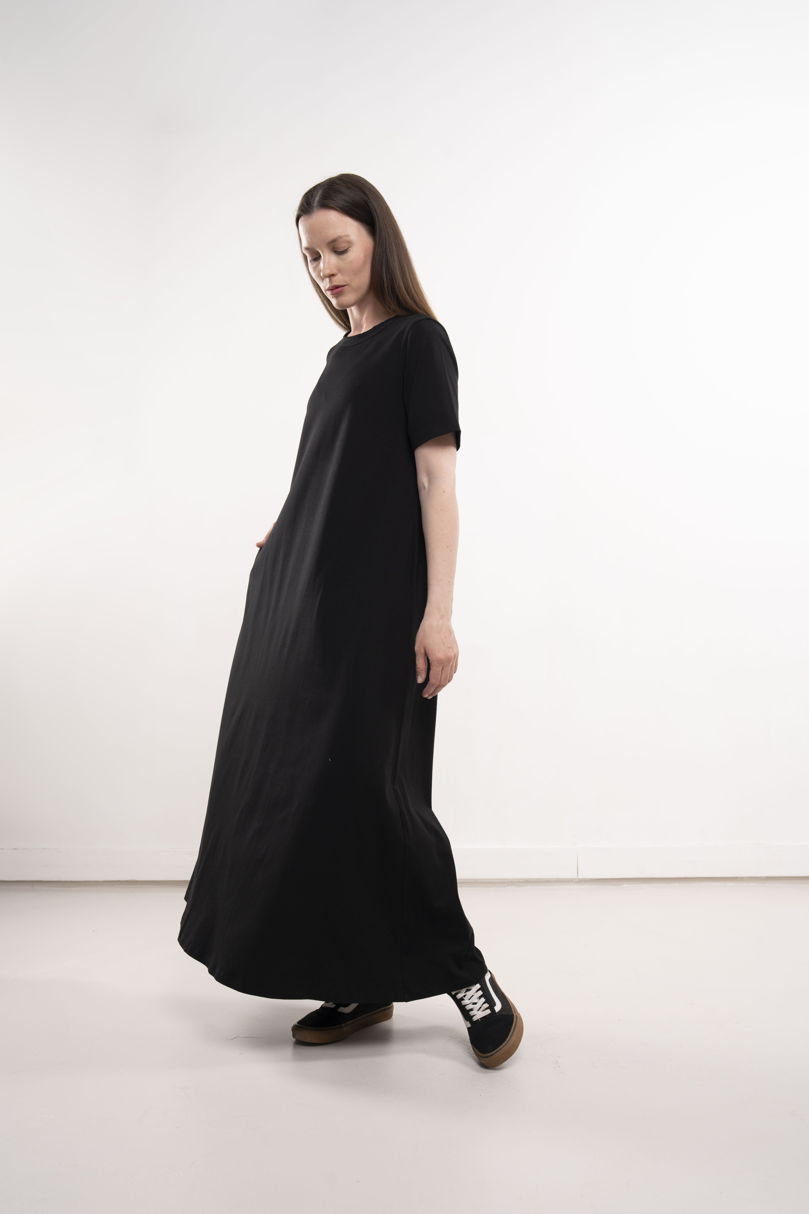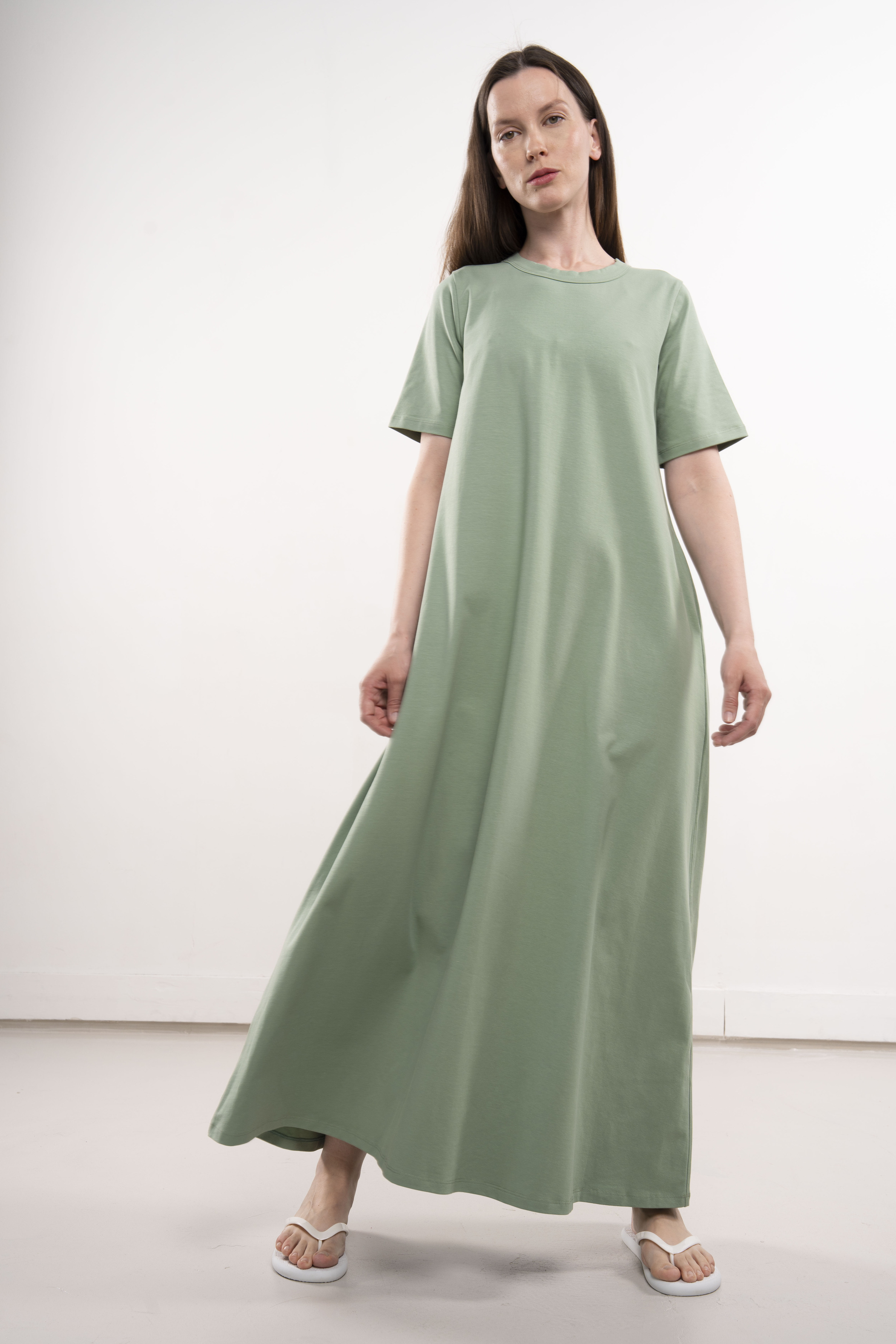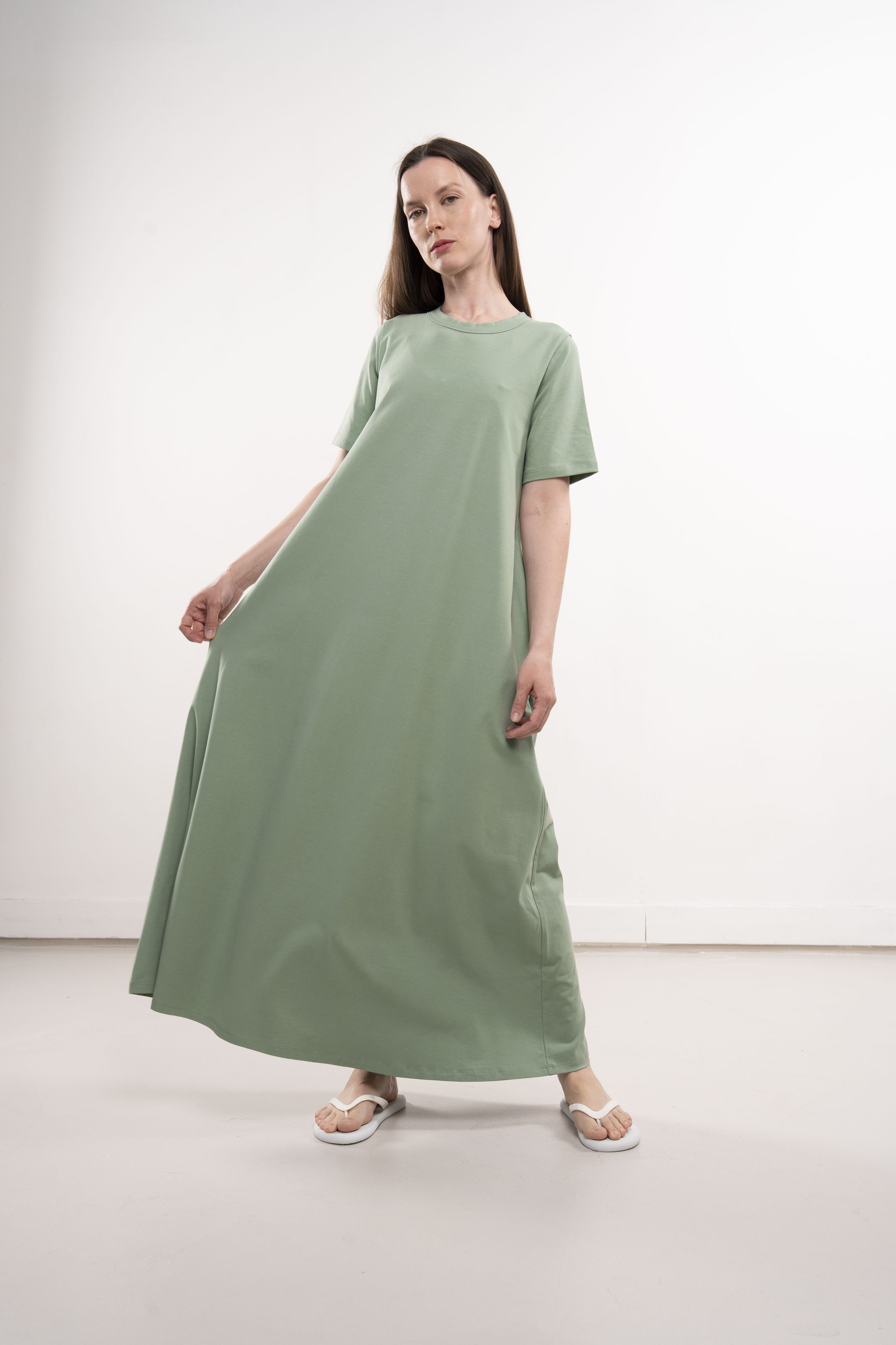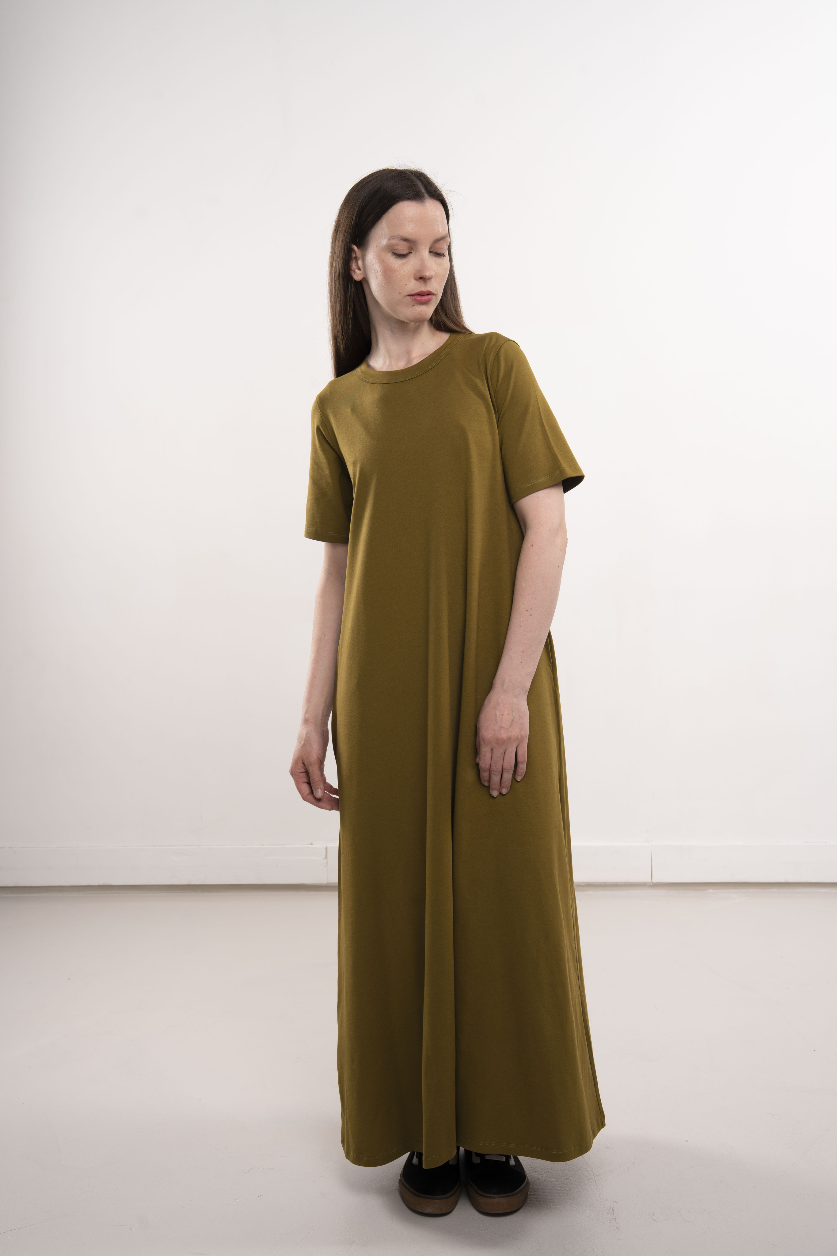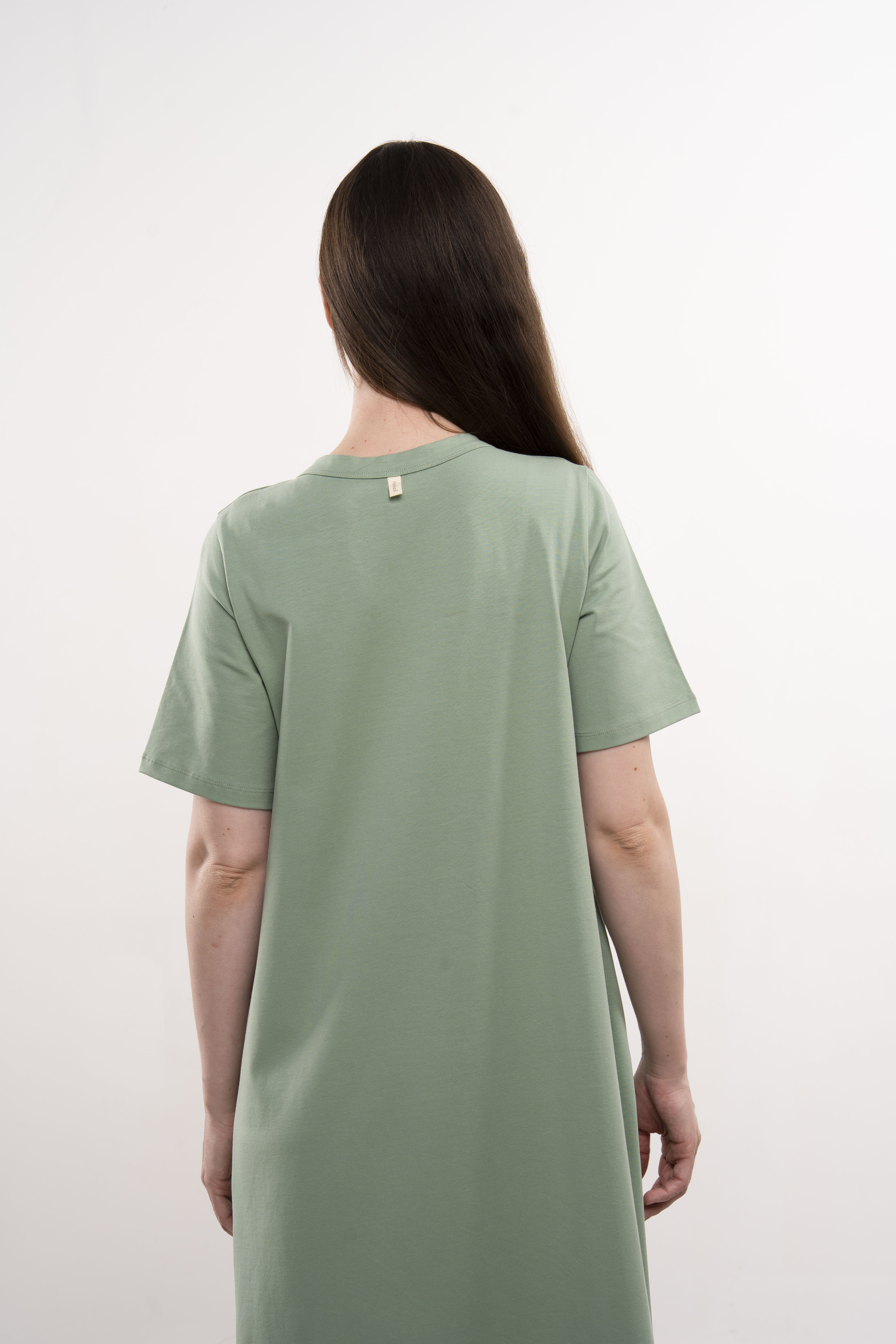 Платье с короткими рукавами и карманами из хлопкового трикотажа пенье.