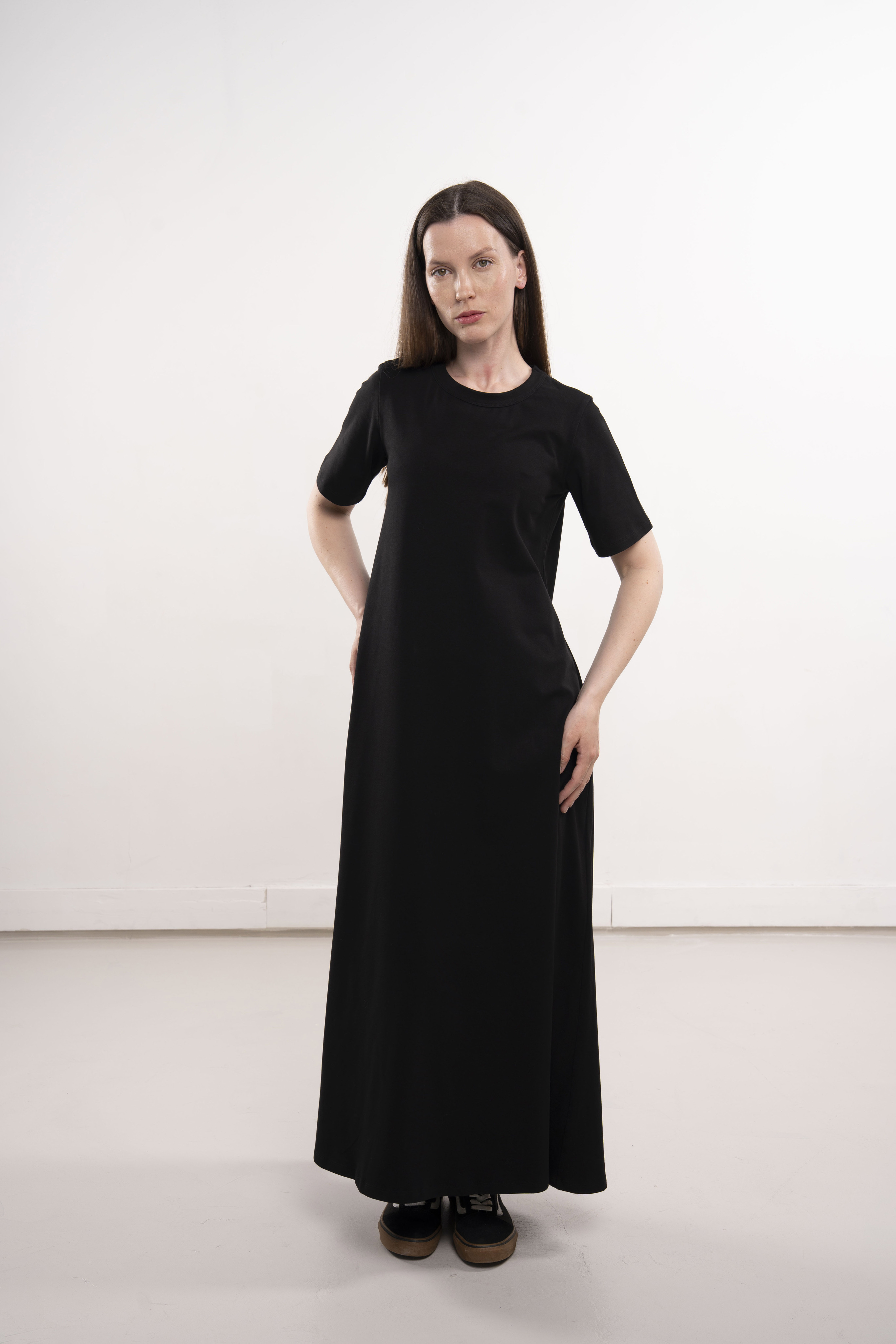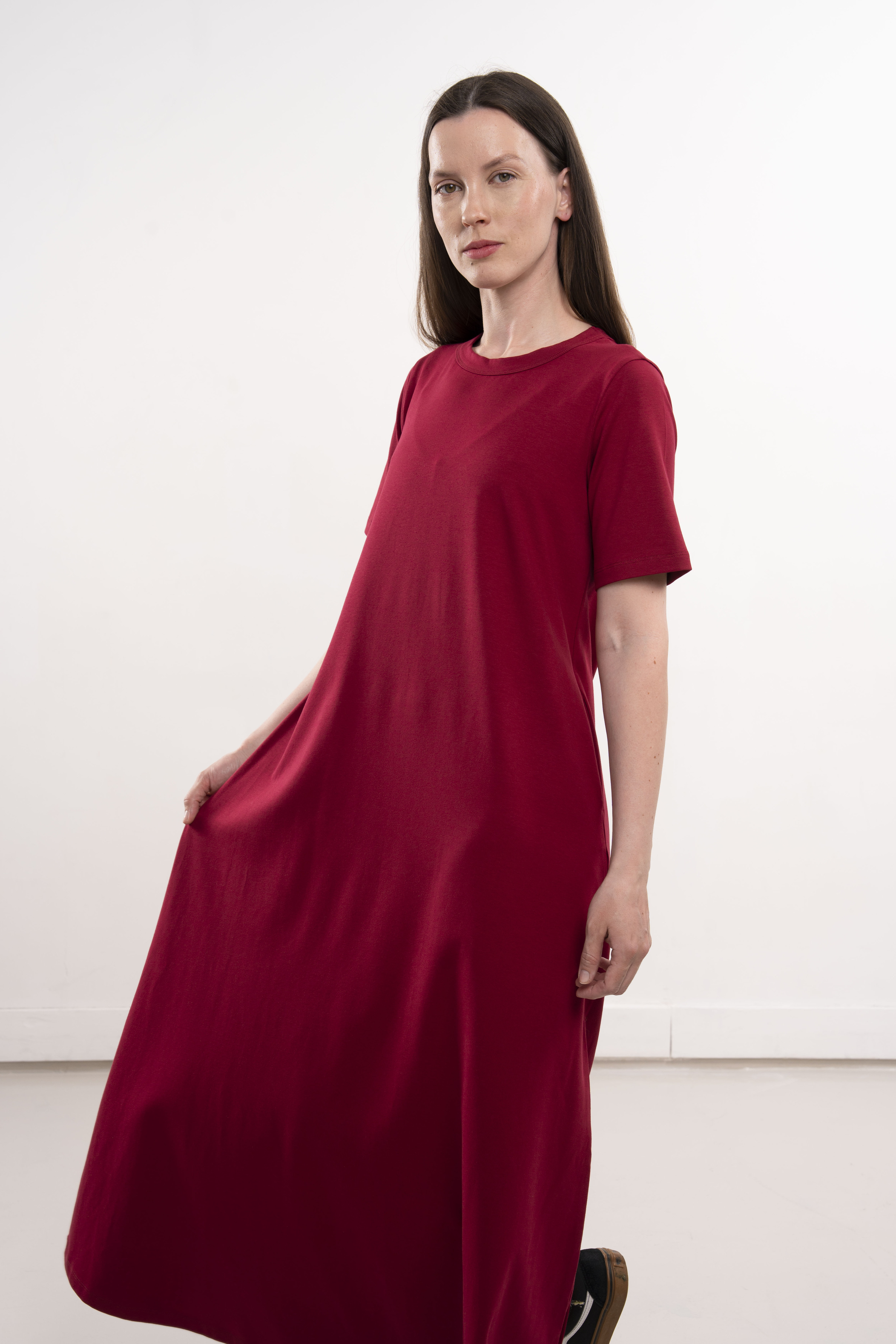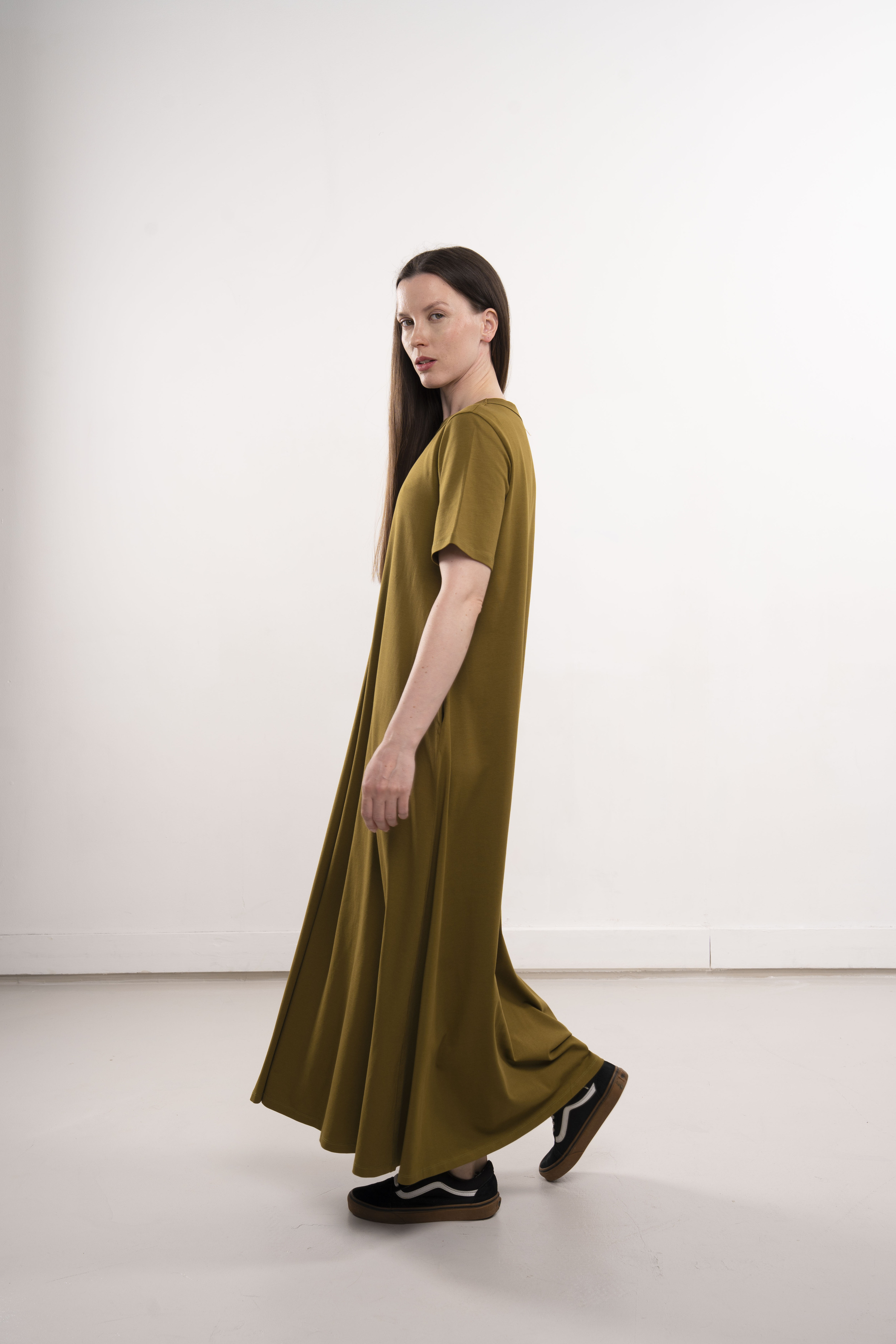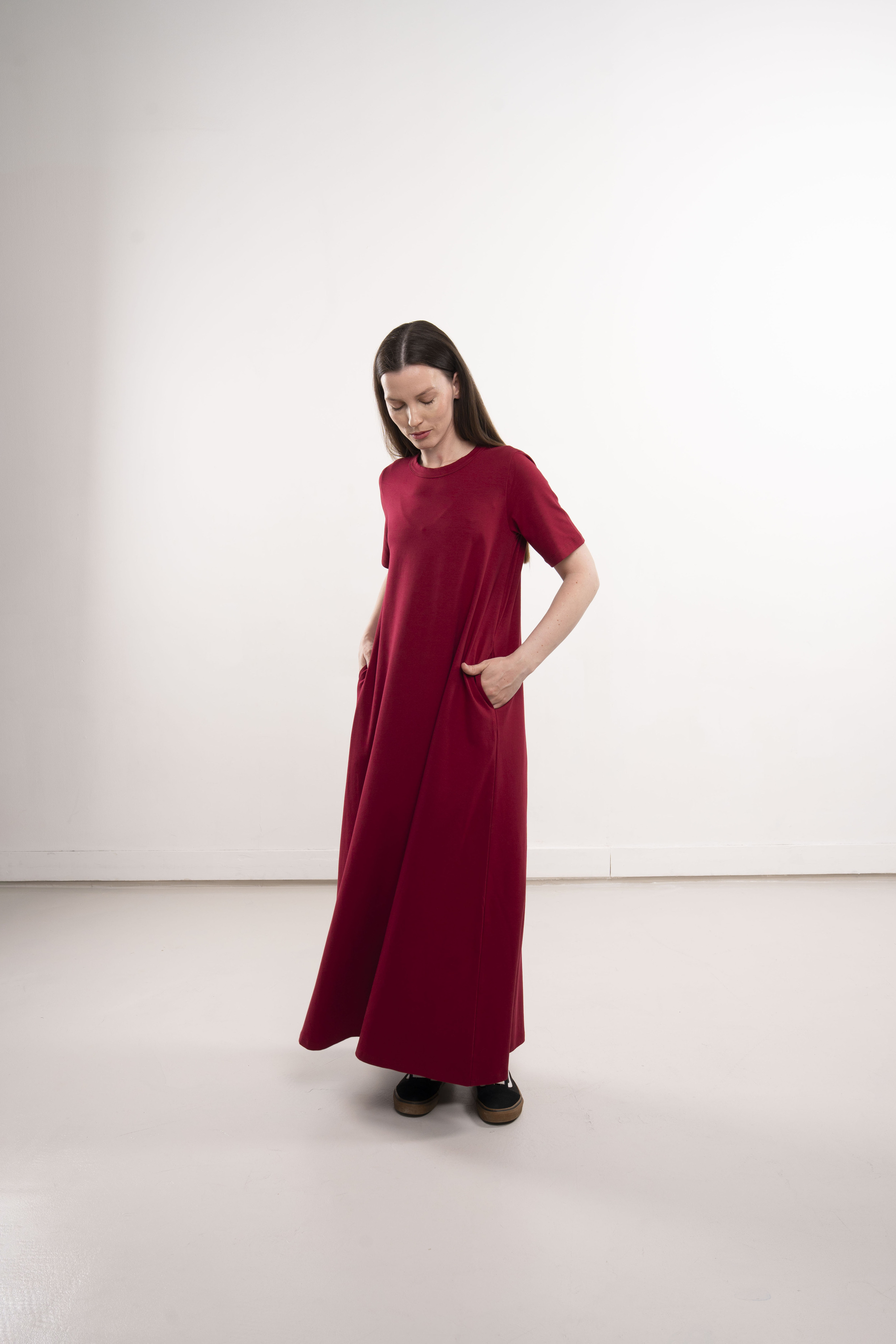 Платье с короткими рукавами и карманами из хлопкового трикотажа пенье.