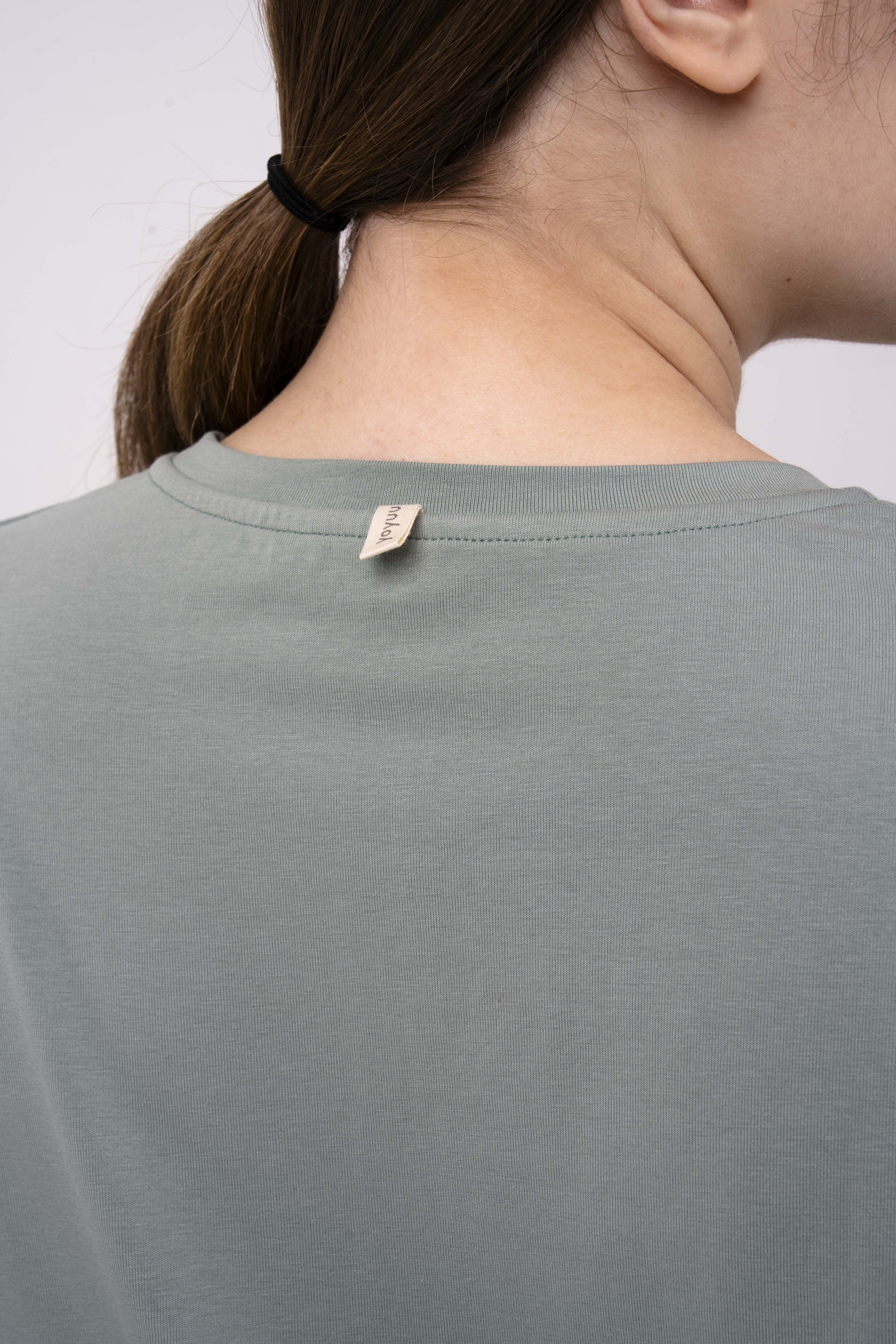 Объемная футболка с классическим круглым вырезом и слегка спущенными широкими рукавами.