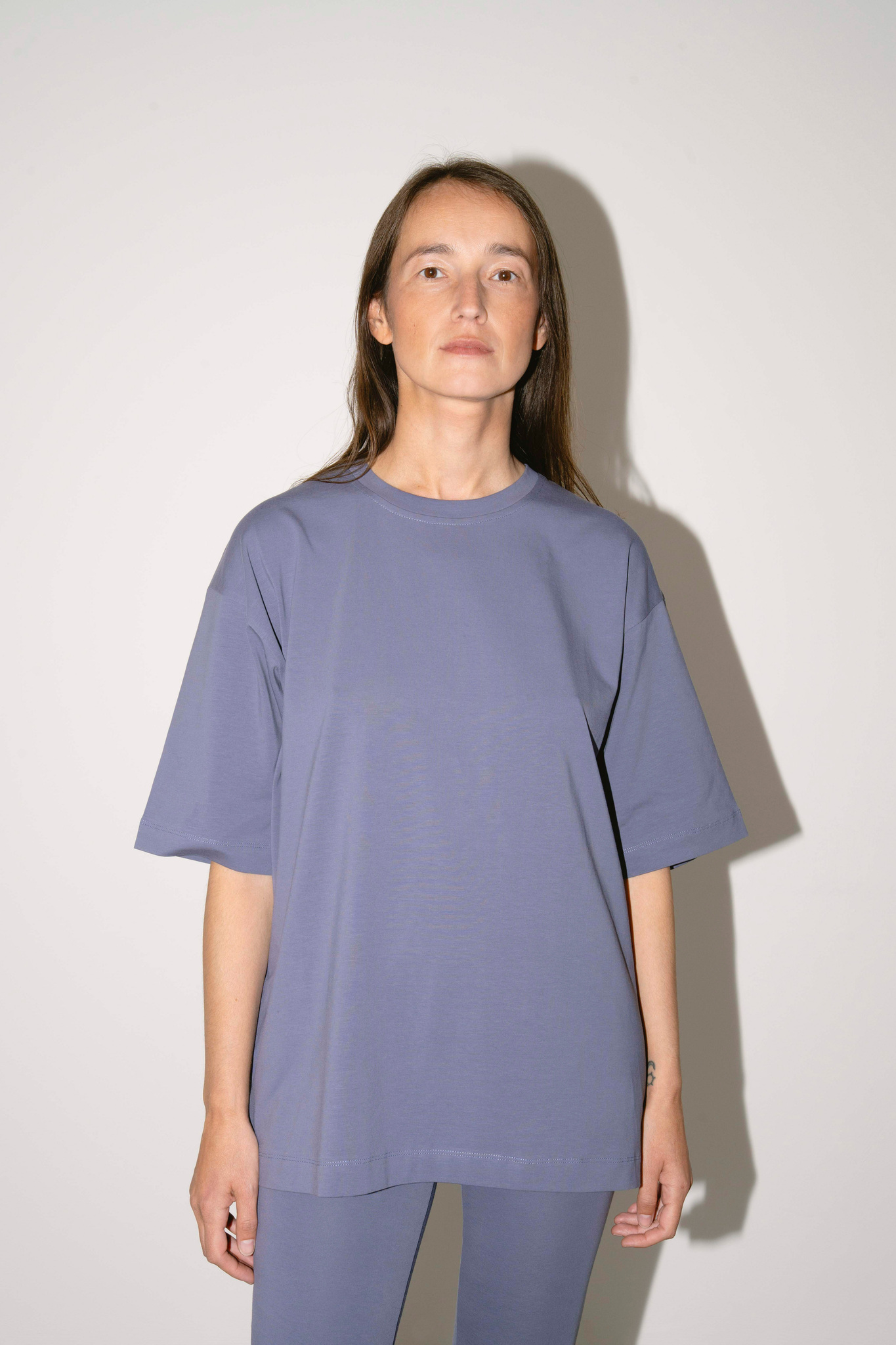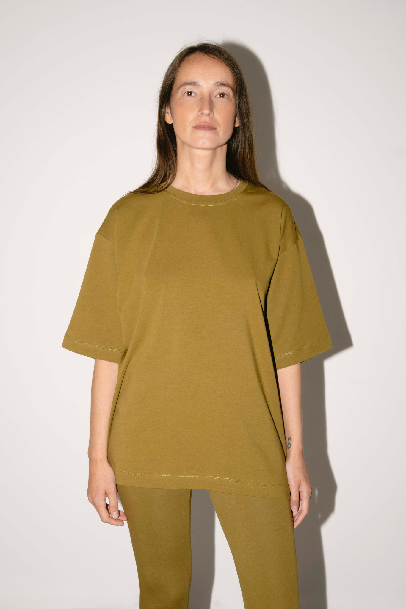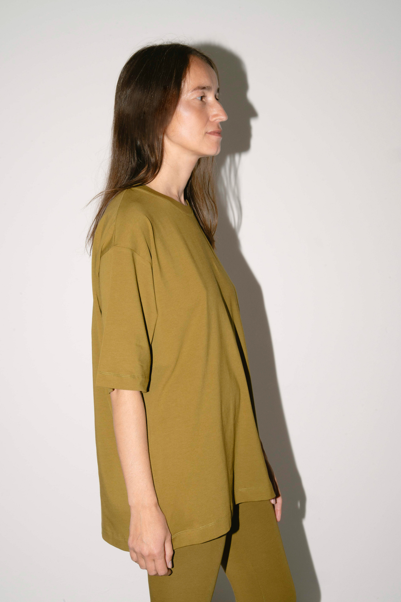 Объемная футболка с классическим круглым вырезом и слегка спущенными широкими рукавами.