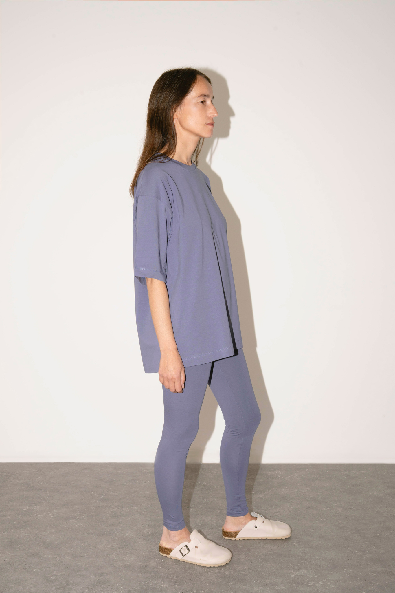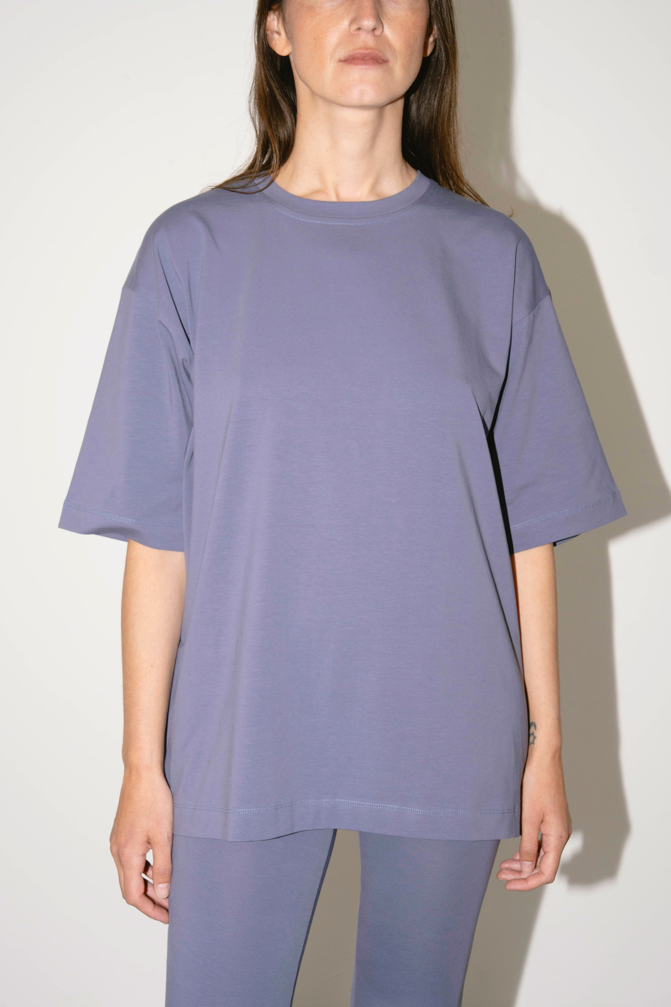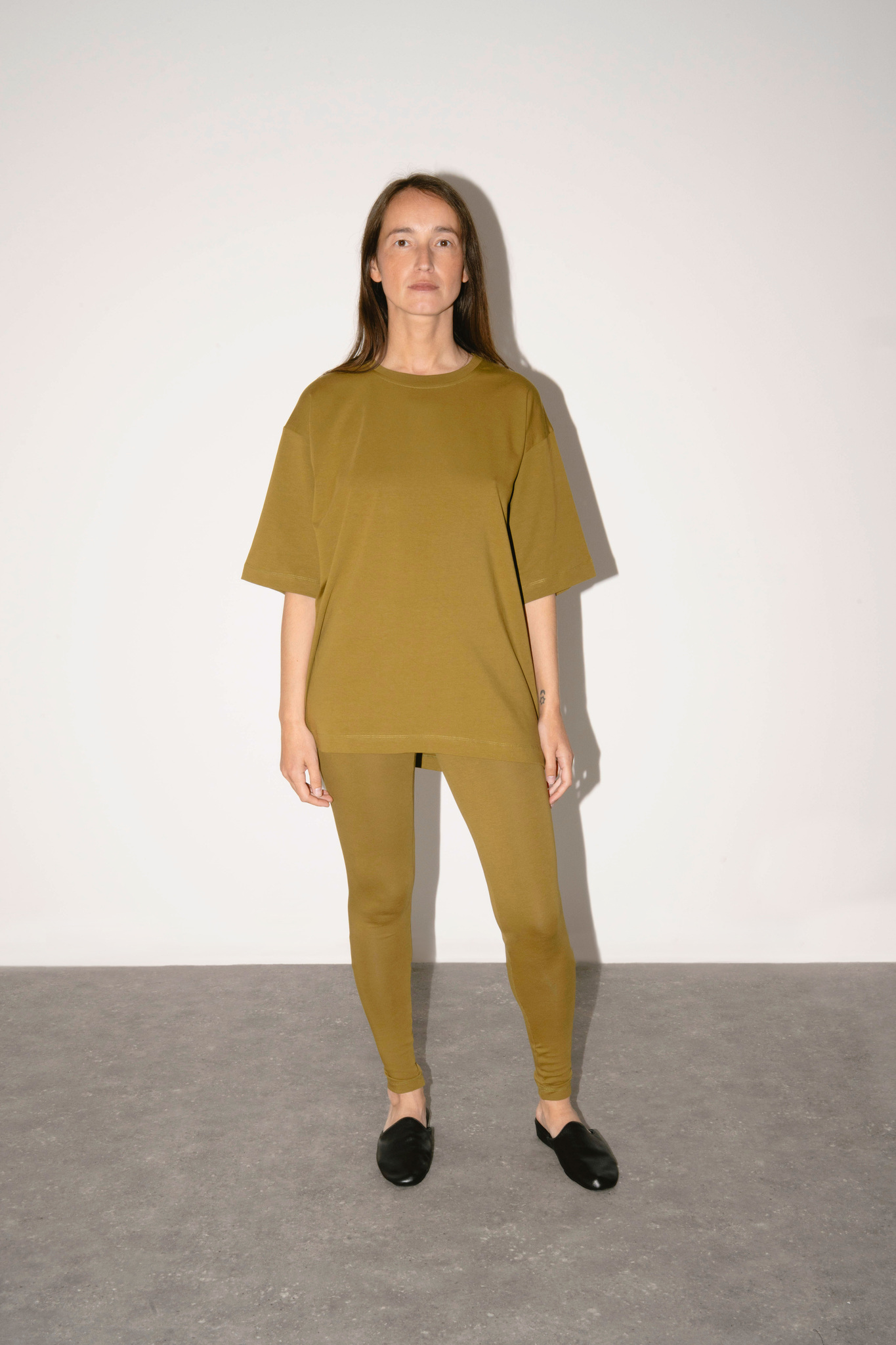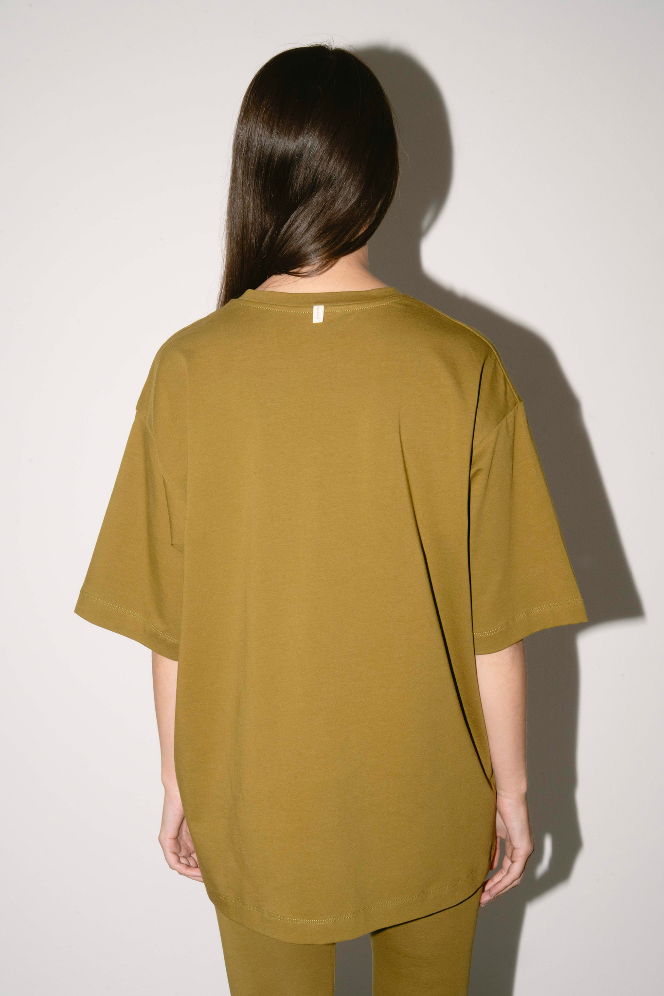 Объемная футболка с классическим круглым вырезом и слегка спущенными широкими рукавами.