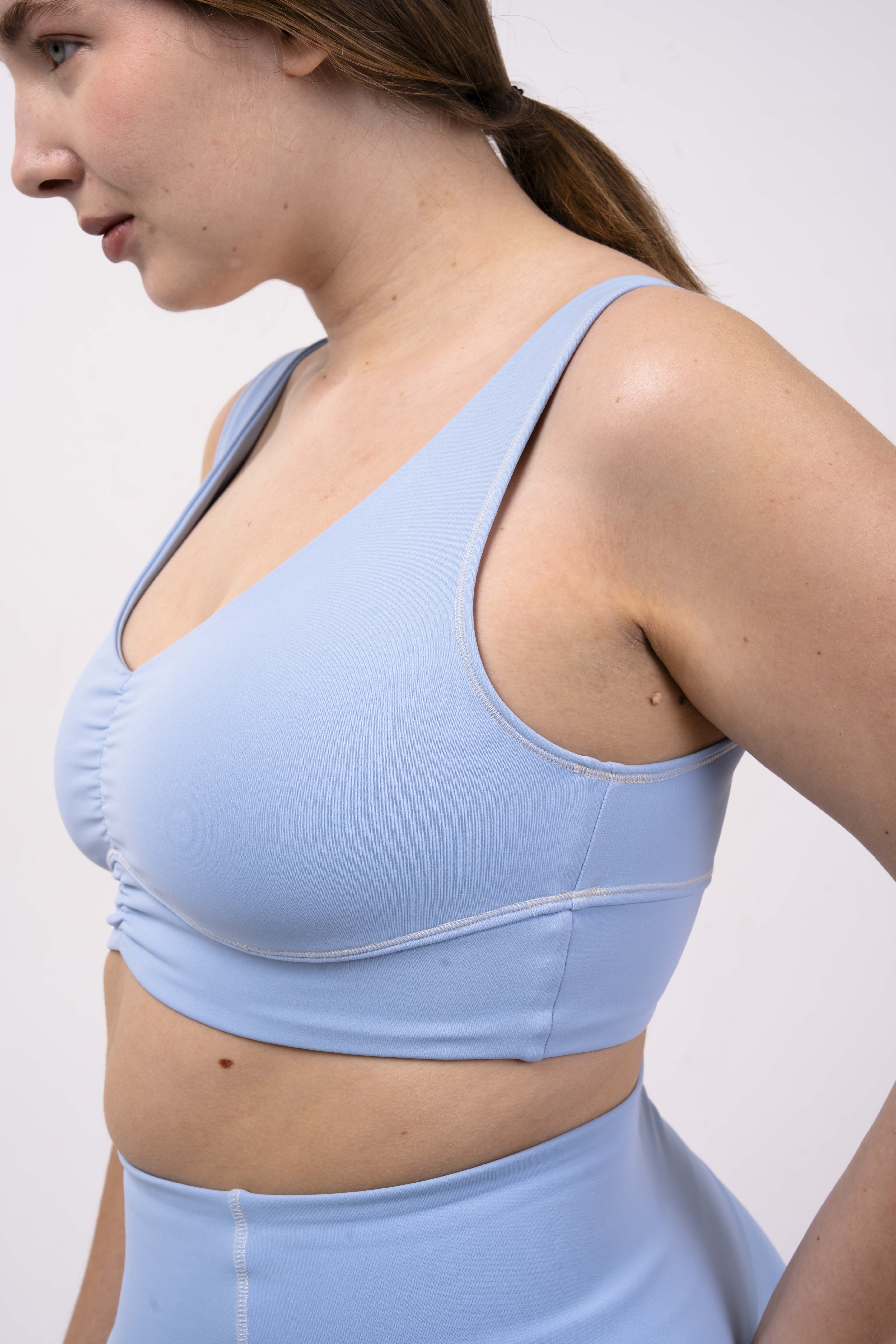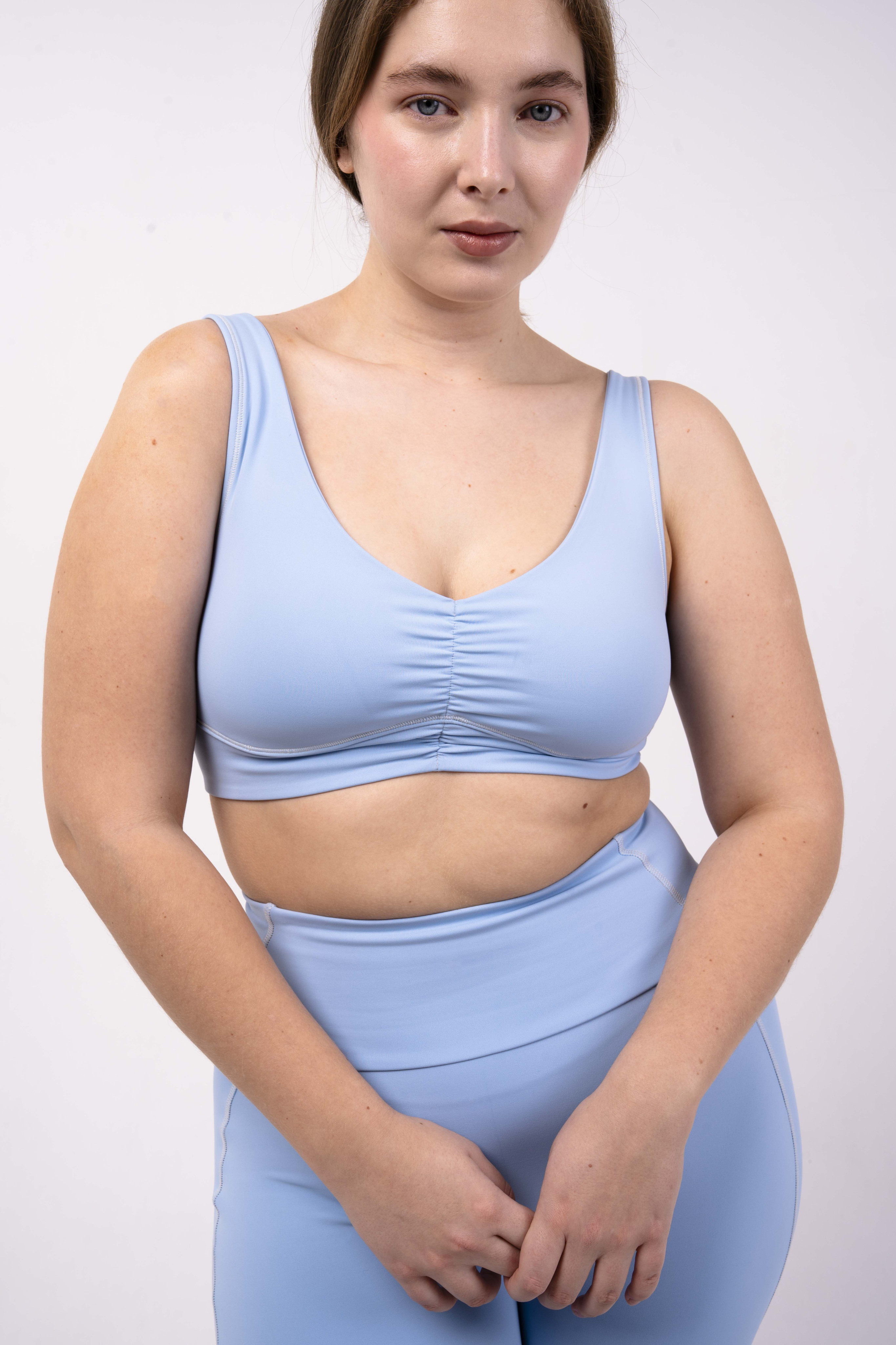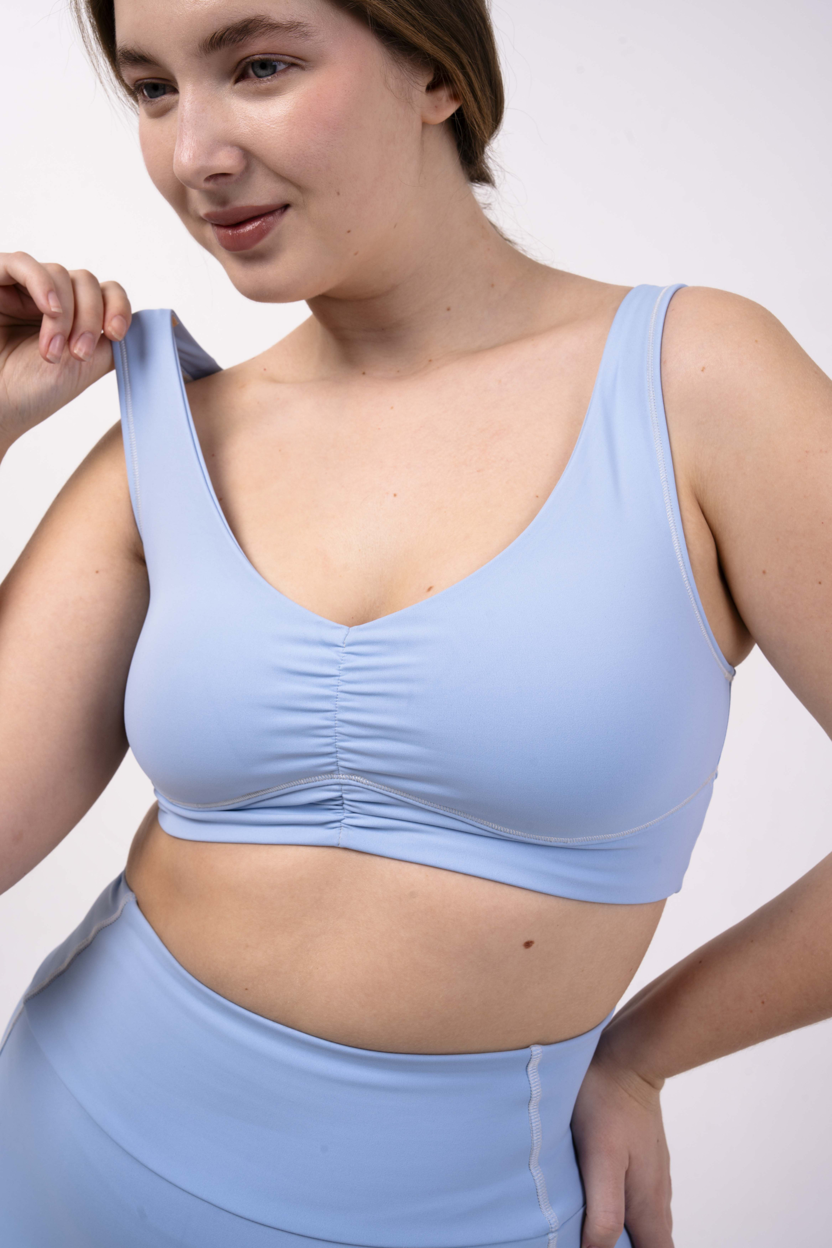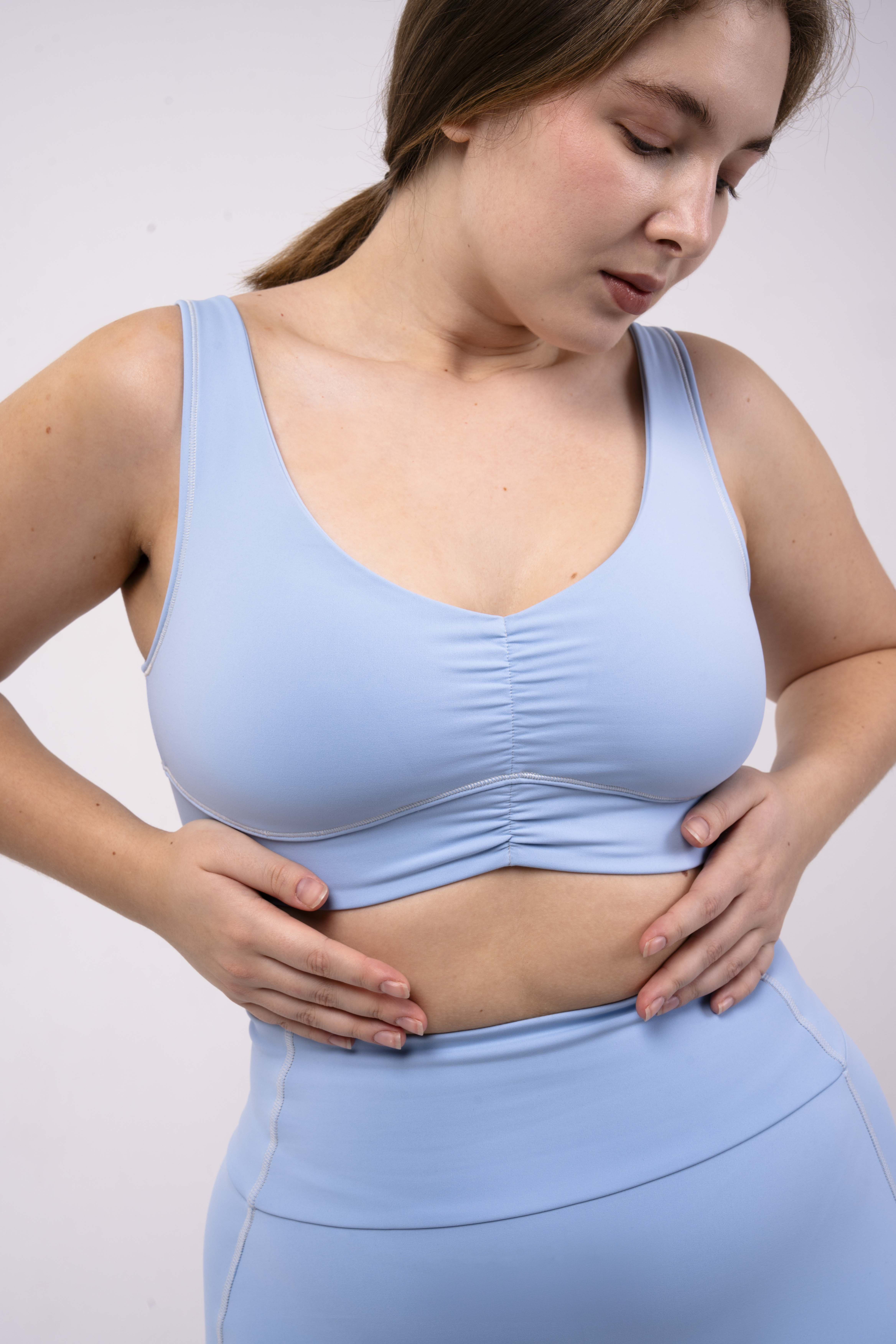 Углубленный вырез, средняя/легкая степень поддержки. Для пилатеса, тренировок в зале и танцев.