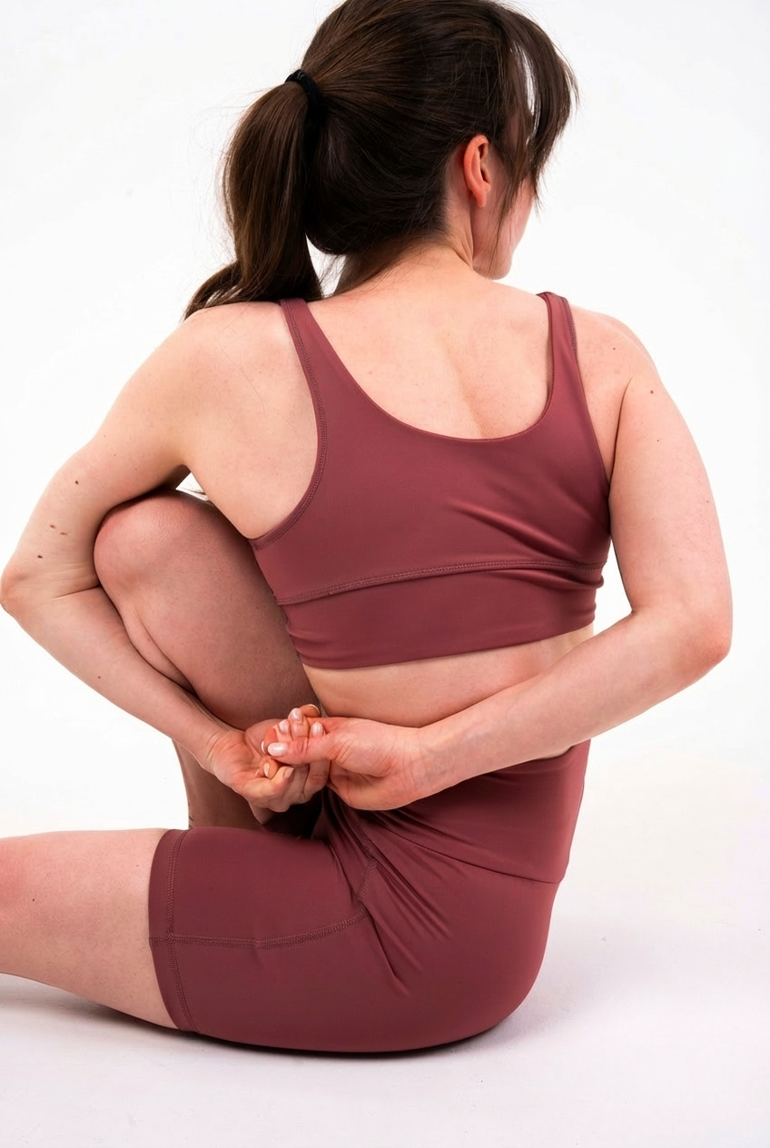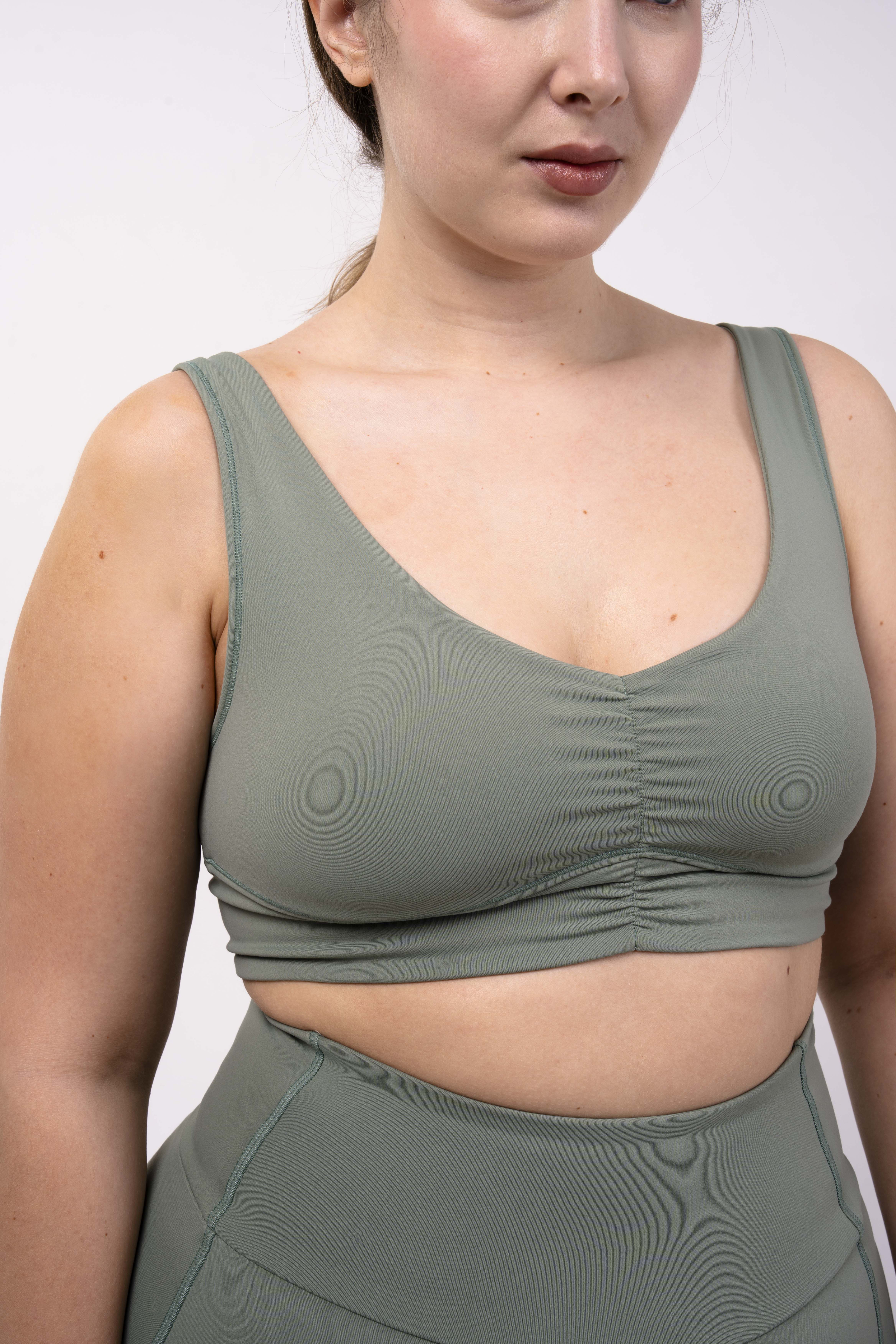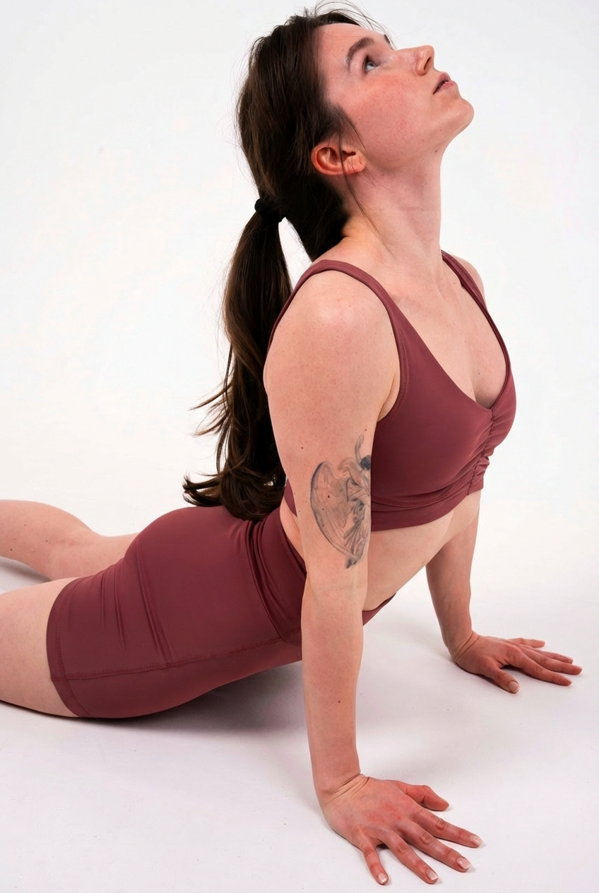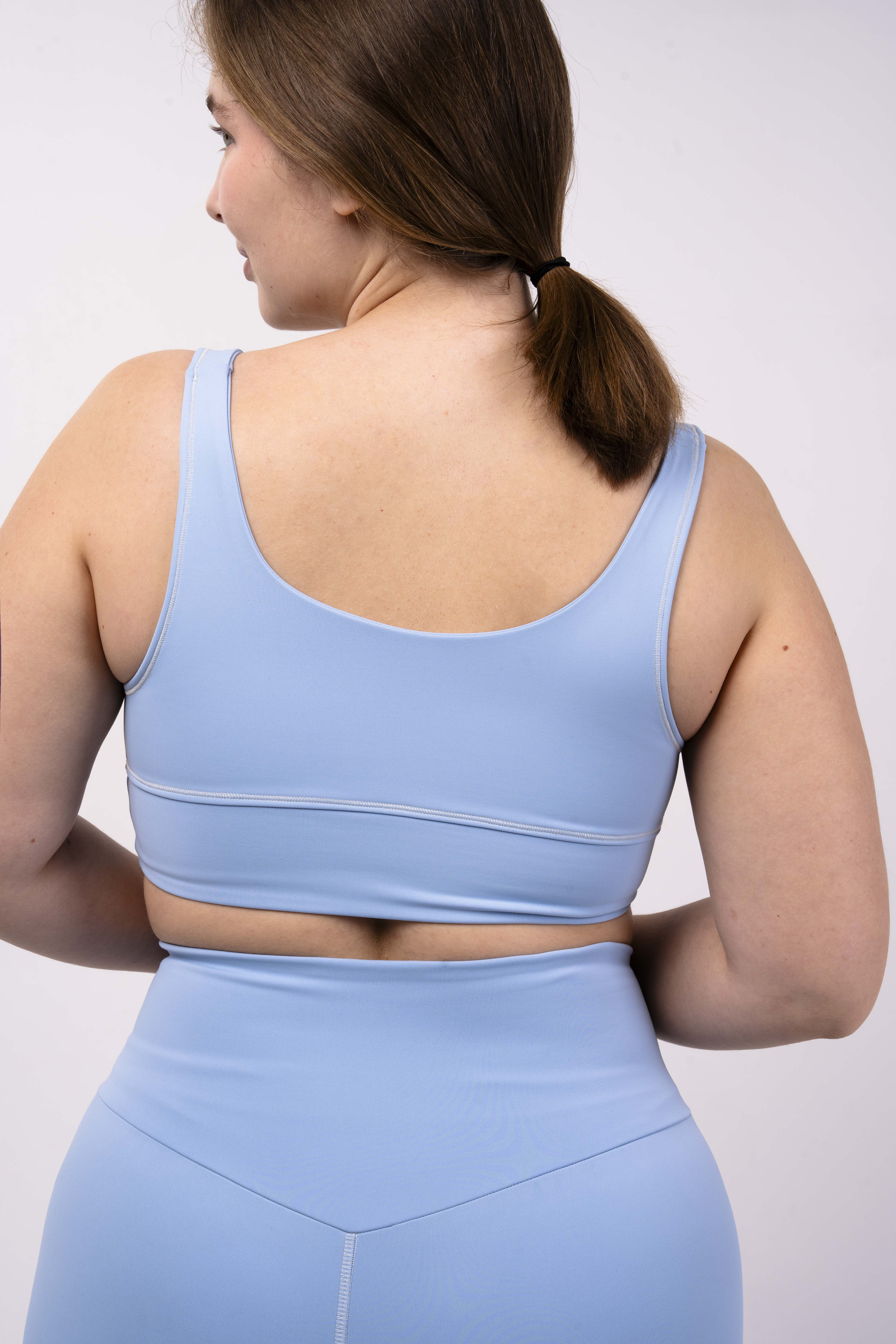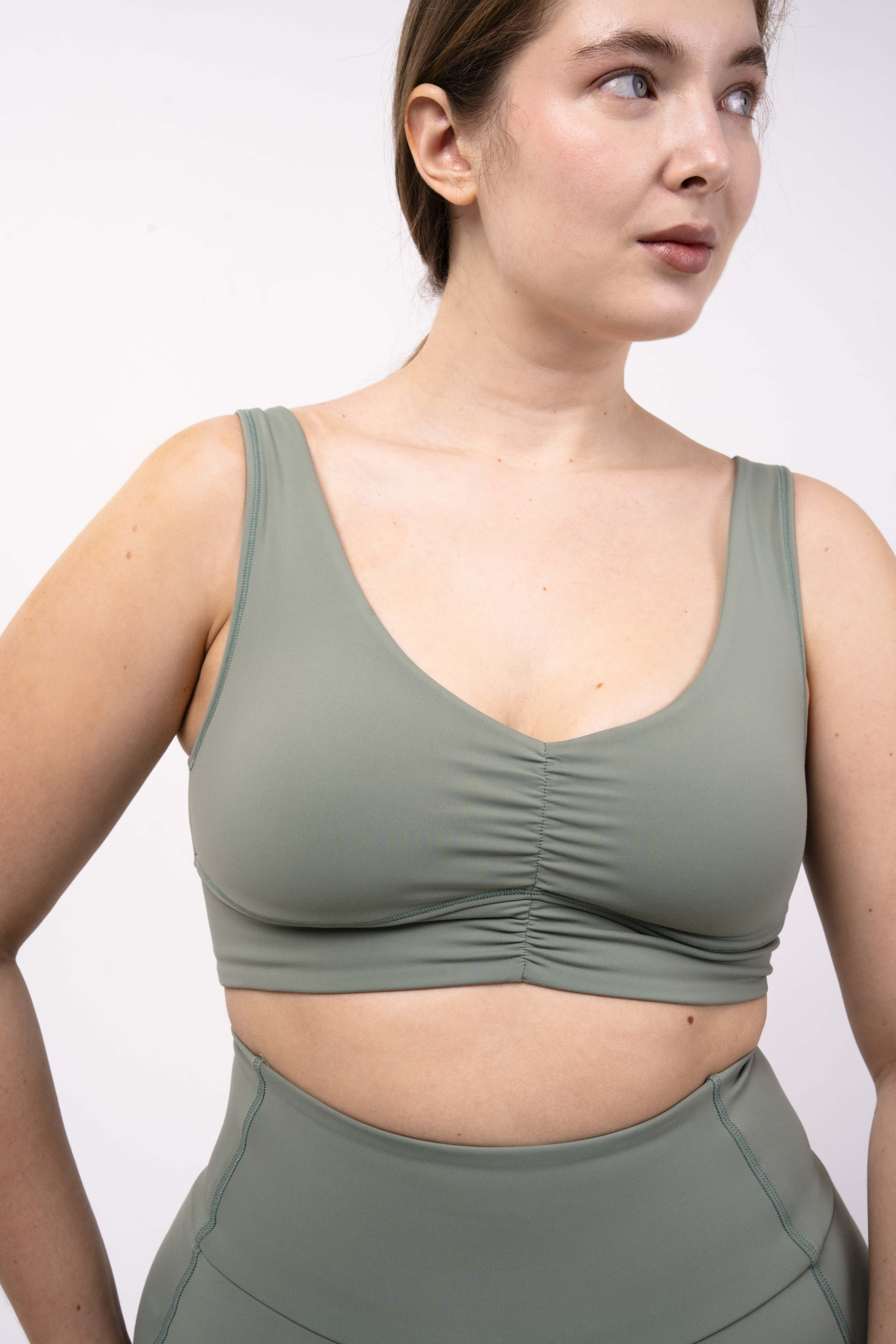 Углубленный вырез, средняя/легкая степень поддержки. Для пилатеса, тренировок в зале и танцев.