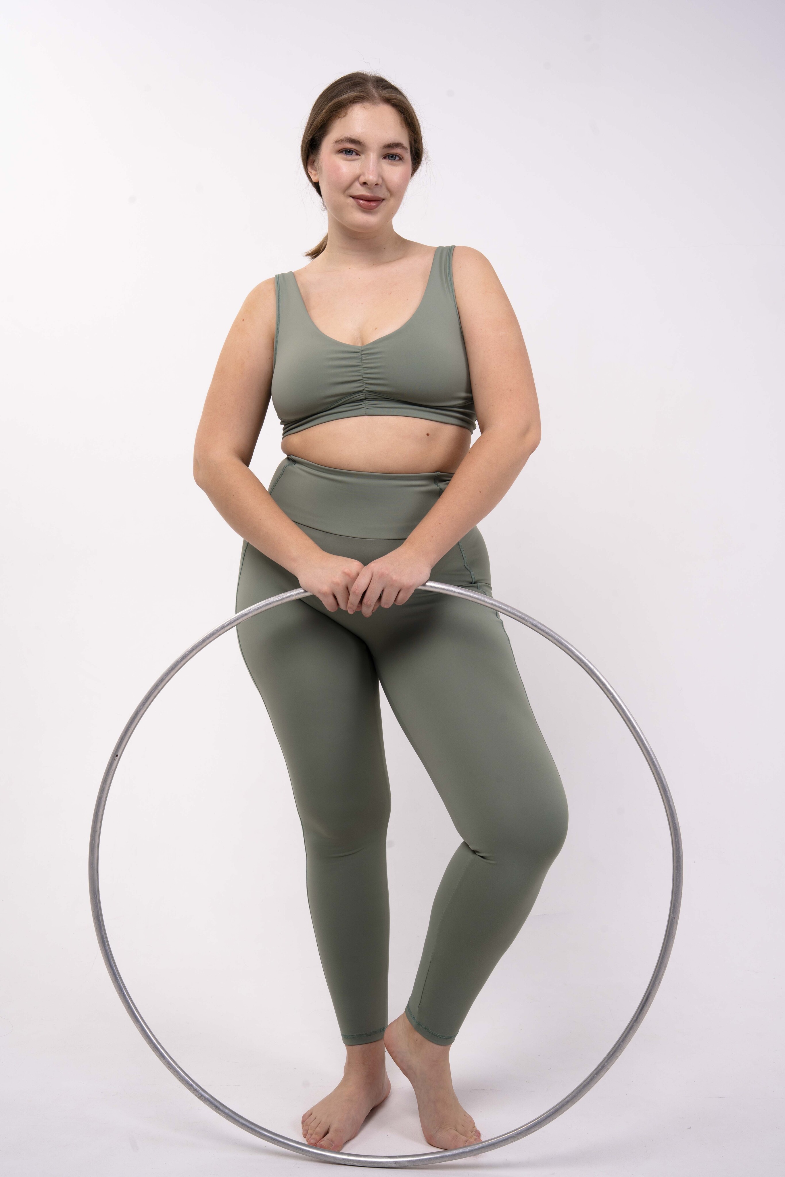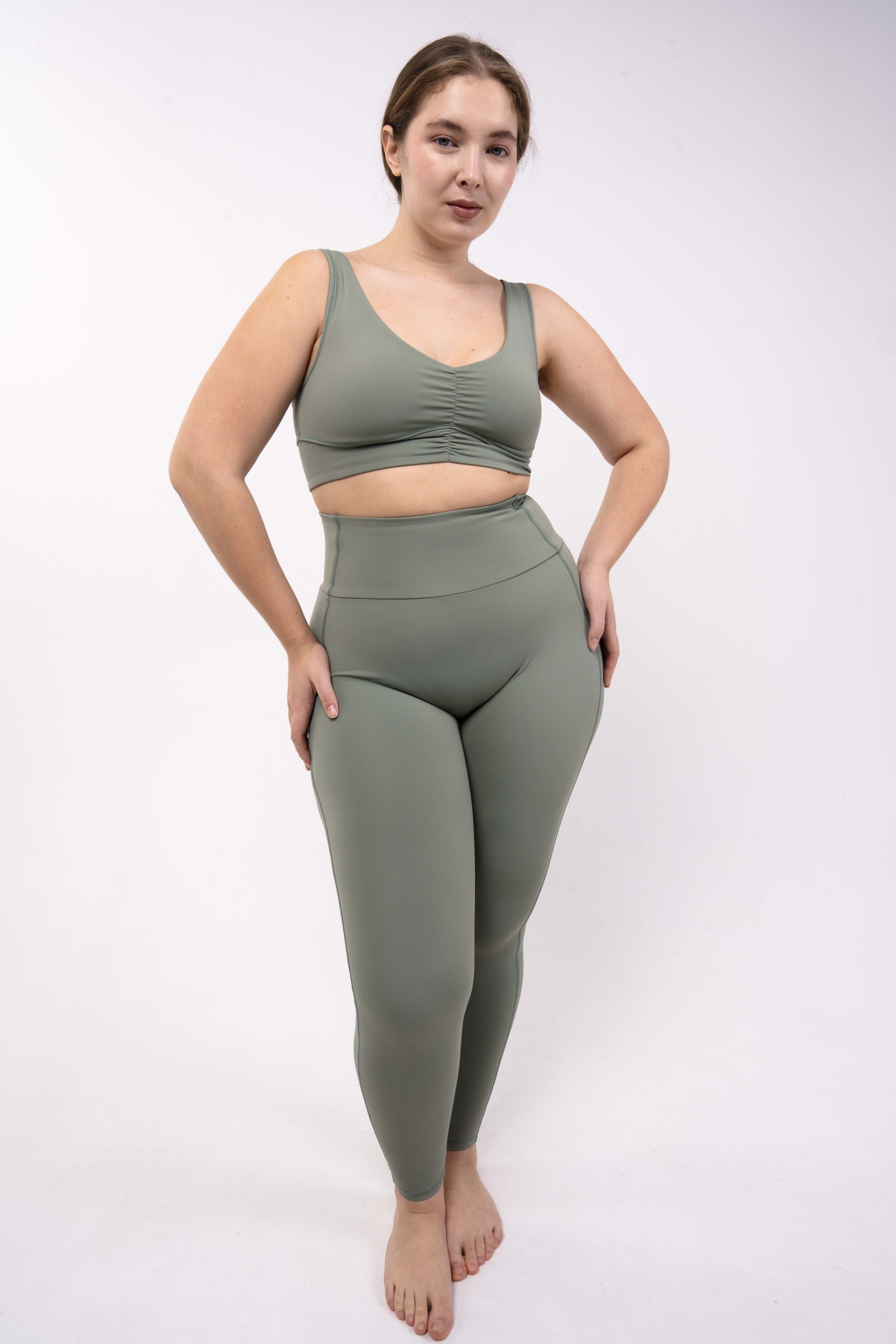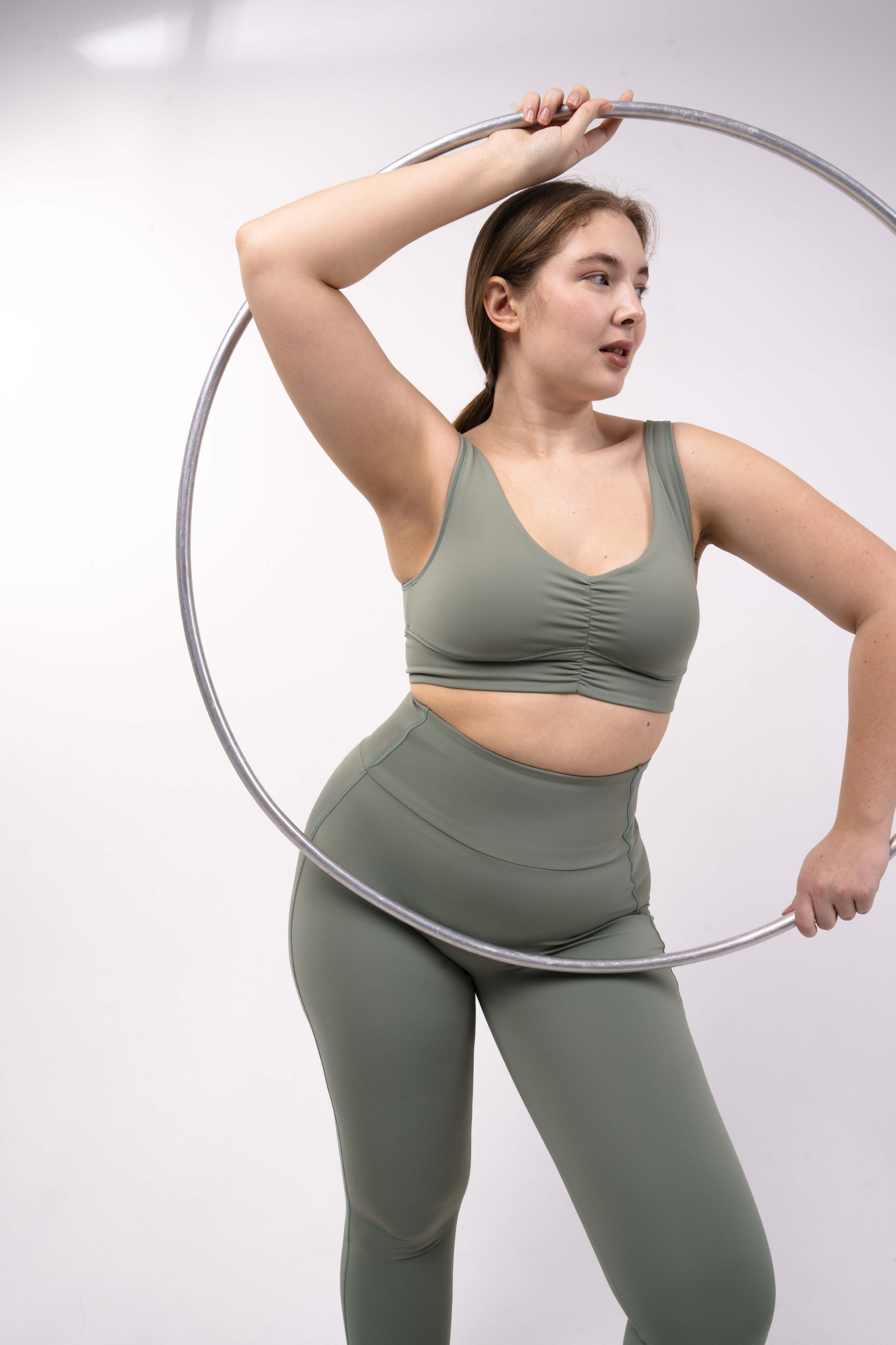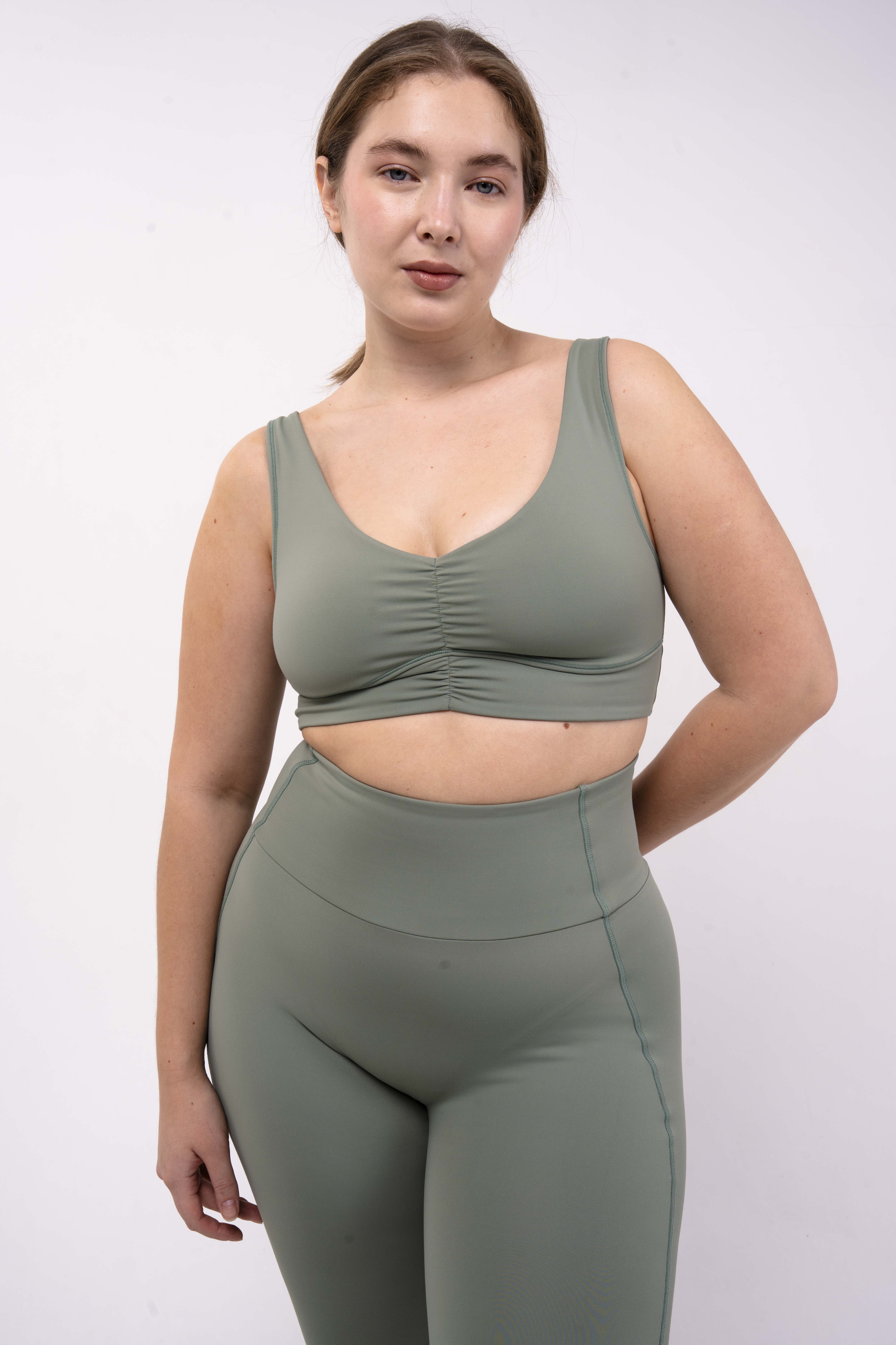 Углубленный вырез, средняя/легкая степень поддержки. Для пилатеса, тренировок в зале и танцев.