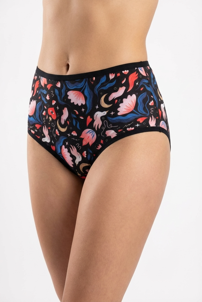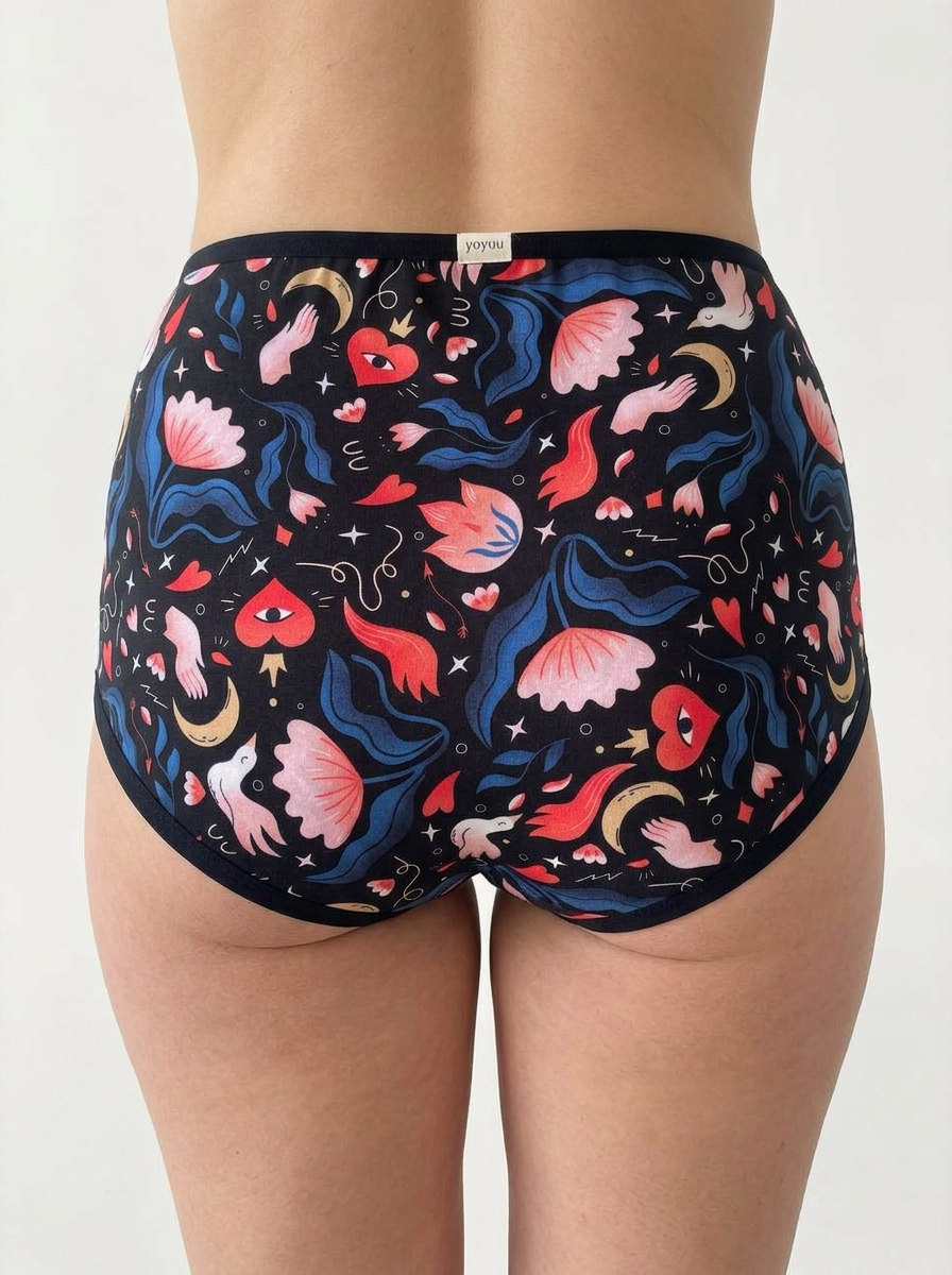 Высокие трусы в форме с эластичными окантовками по верху и низу, мягкая посадка, яркий живой принт для хорошего настроения и базового комфорта. Обработка текстурированными нитями изнутри, чтобы ничего не натирало.