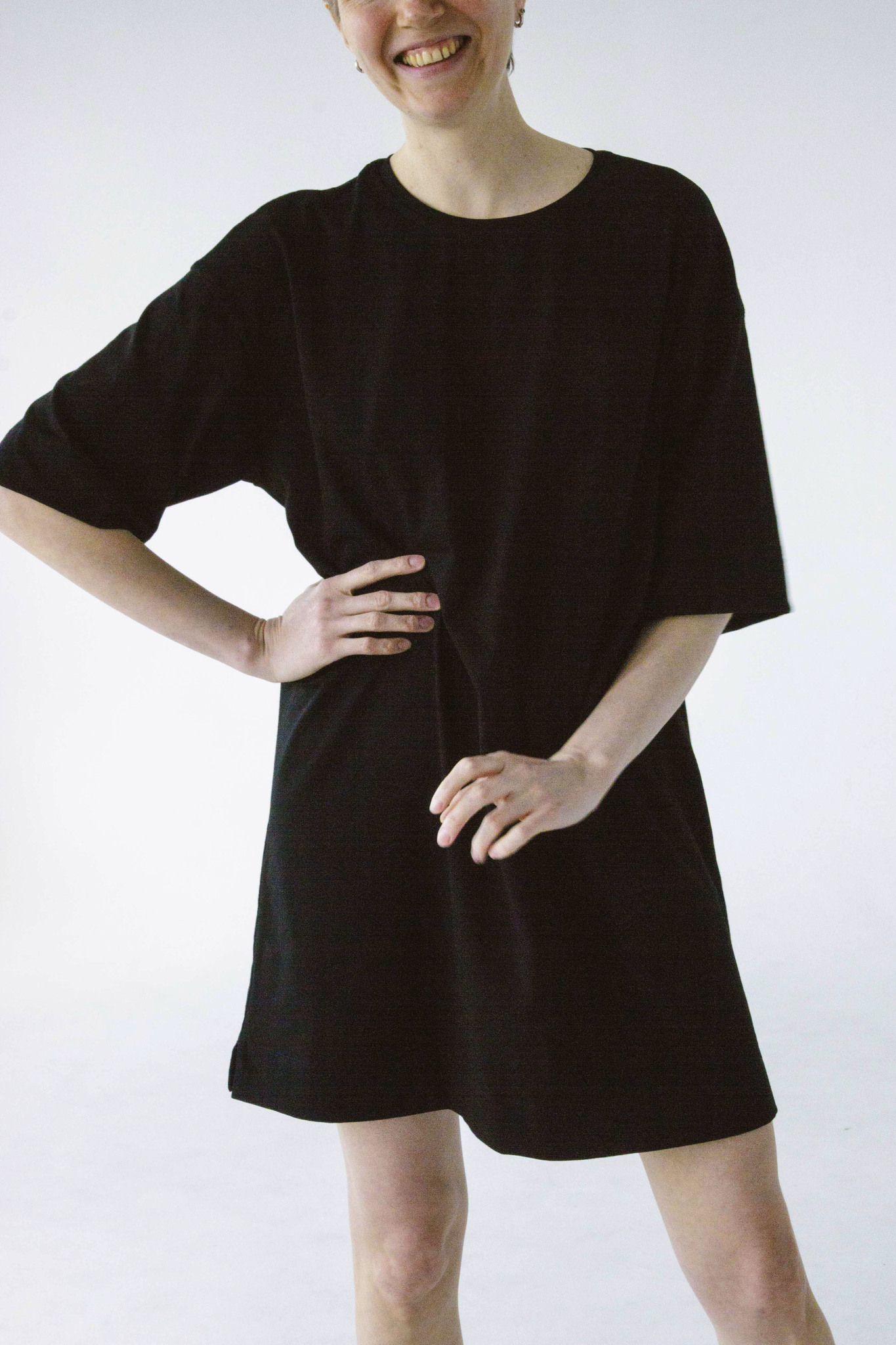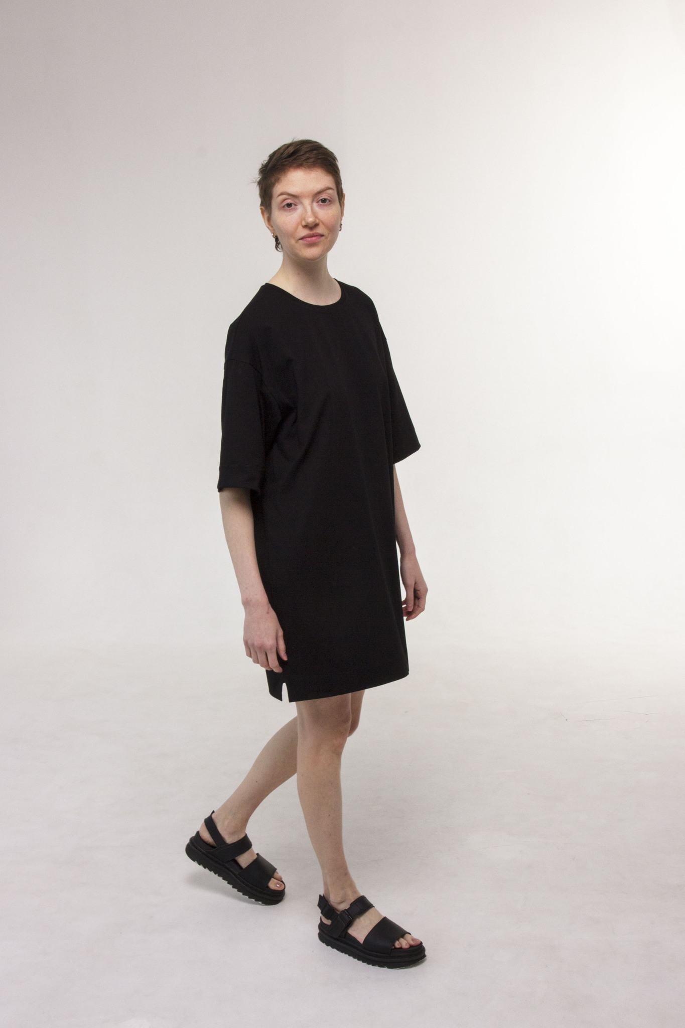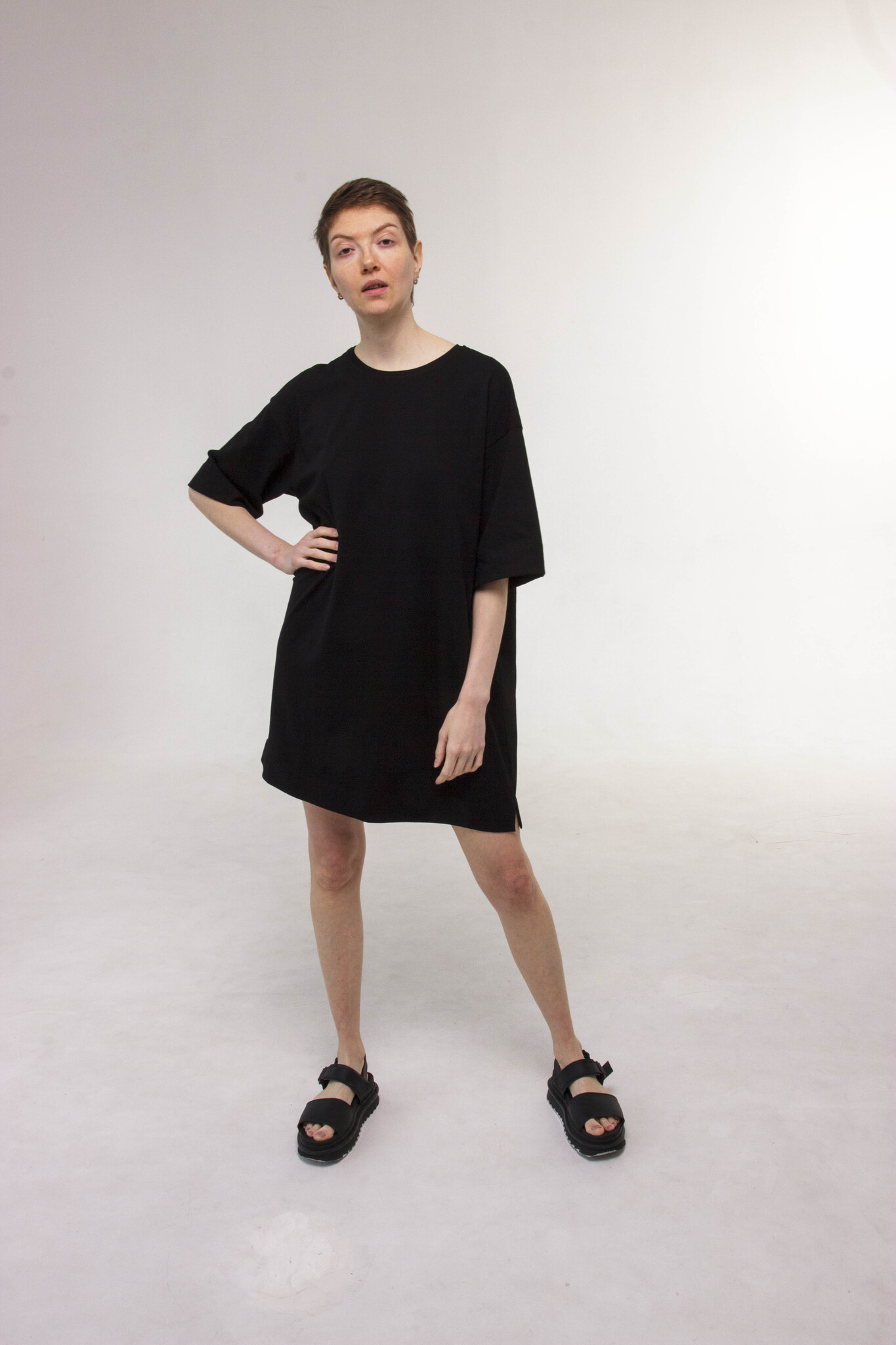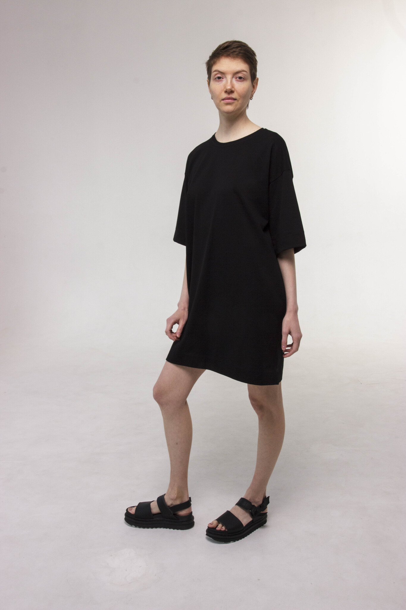 Укороченное свободное платье-футболка с рукавами до локтя