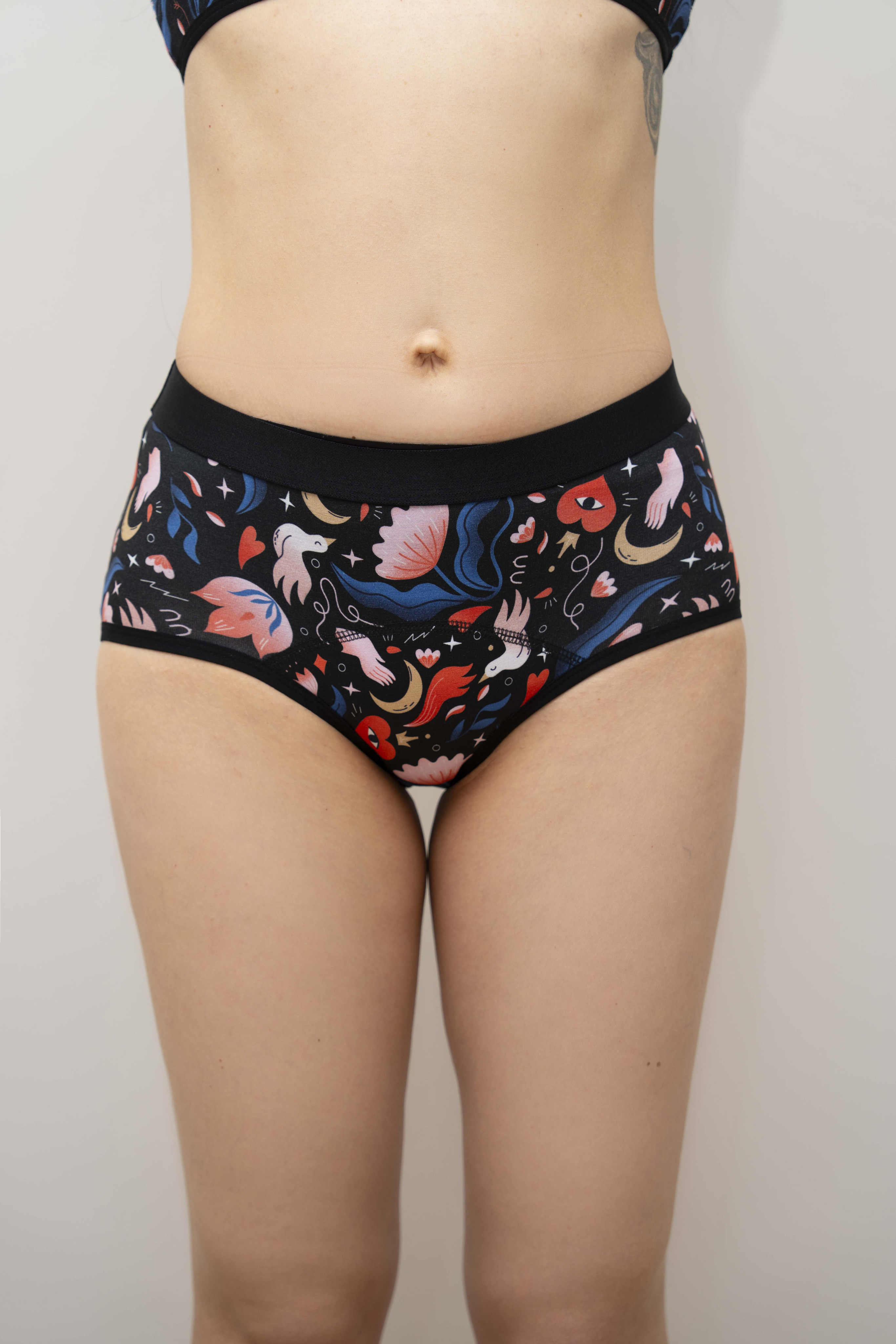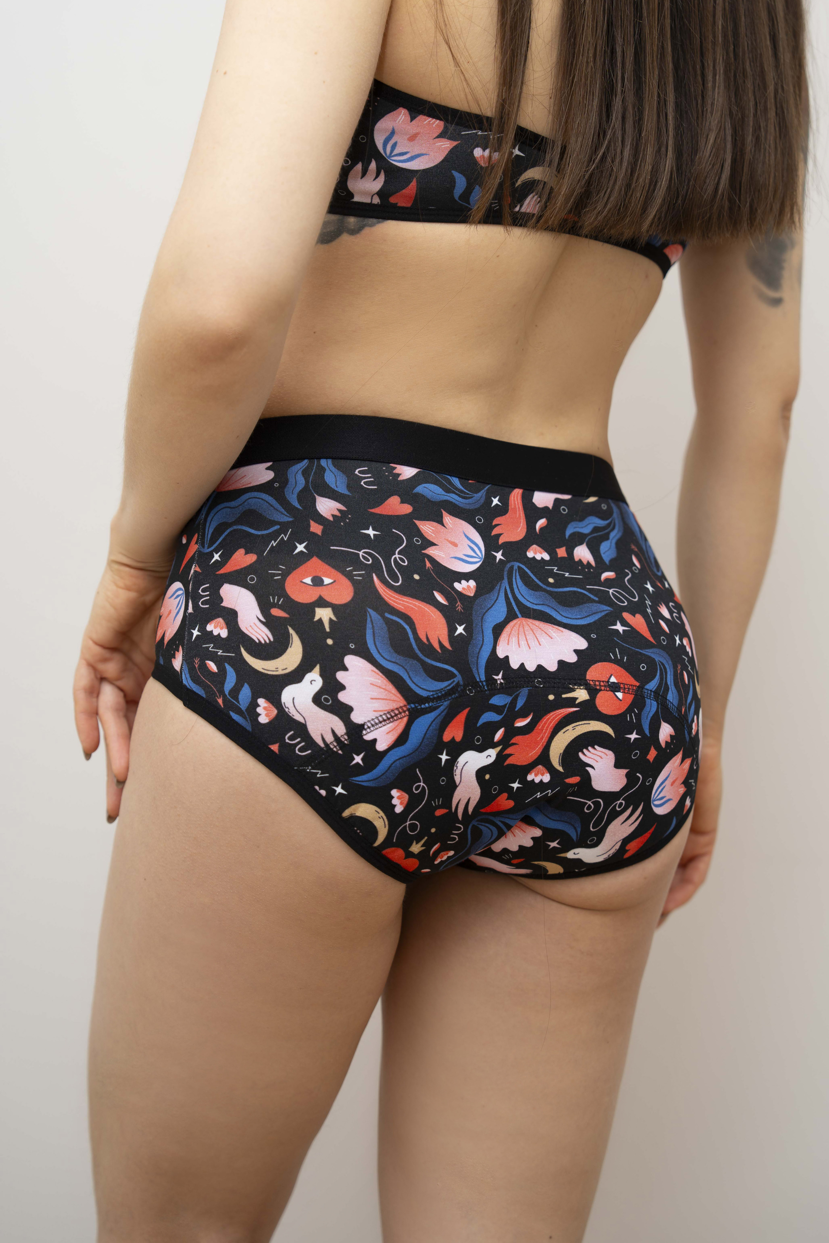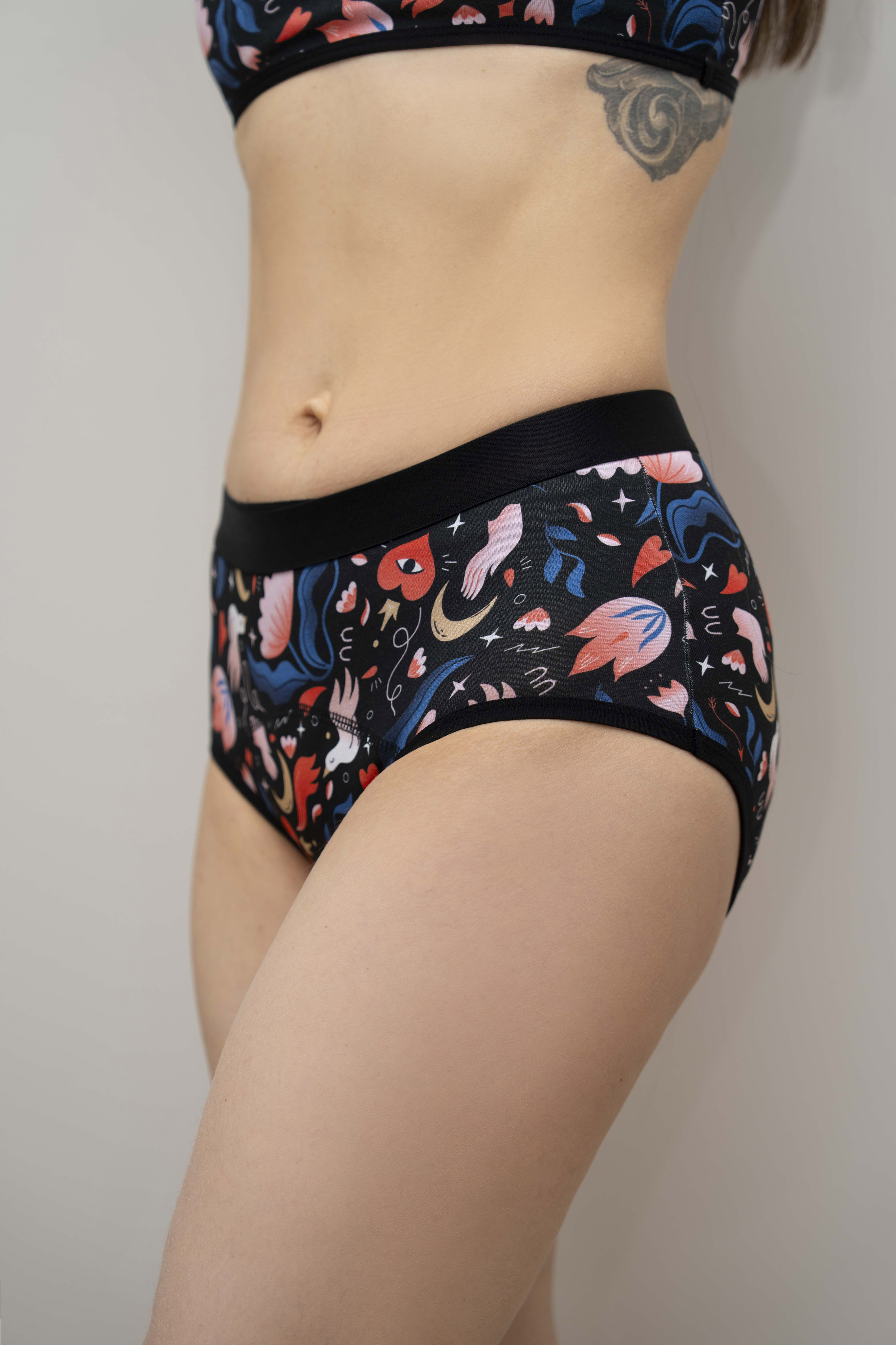 Базовая форма, мягкая посадка и яркий авторский принт, который делает даже самые сложные дни приятнее. Эти трусы созданы, чтобы поддерживать вас в любом состоянии: от первых до самых лёгких дней цикла.