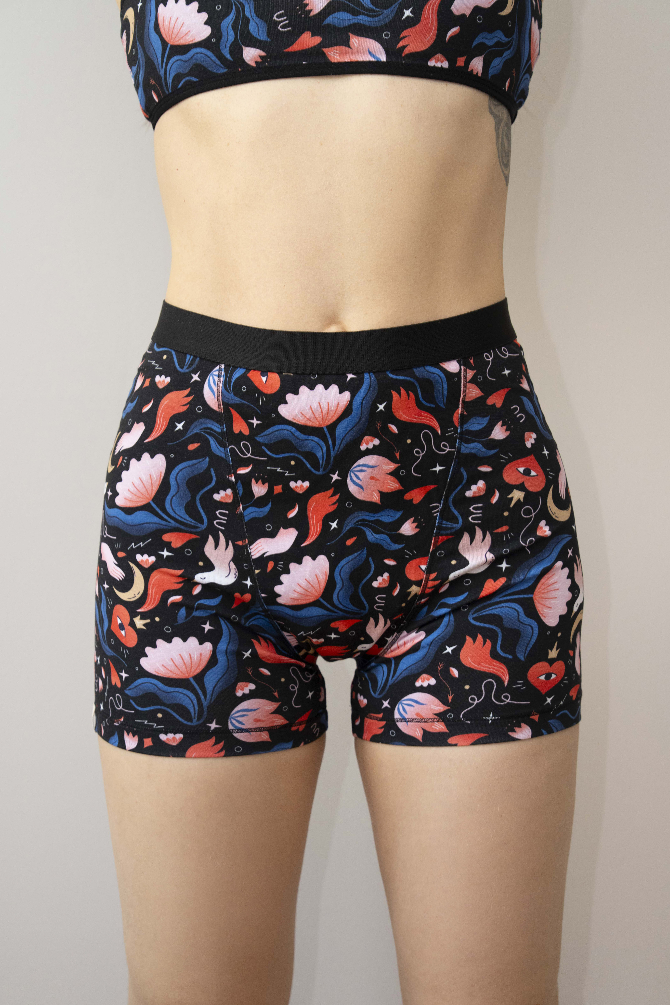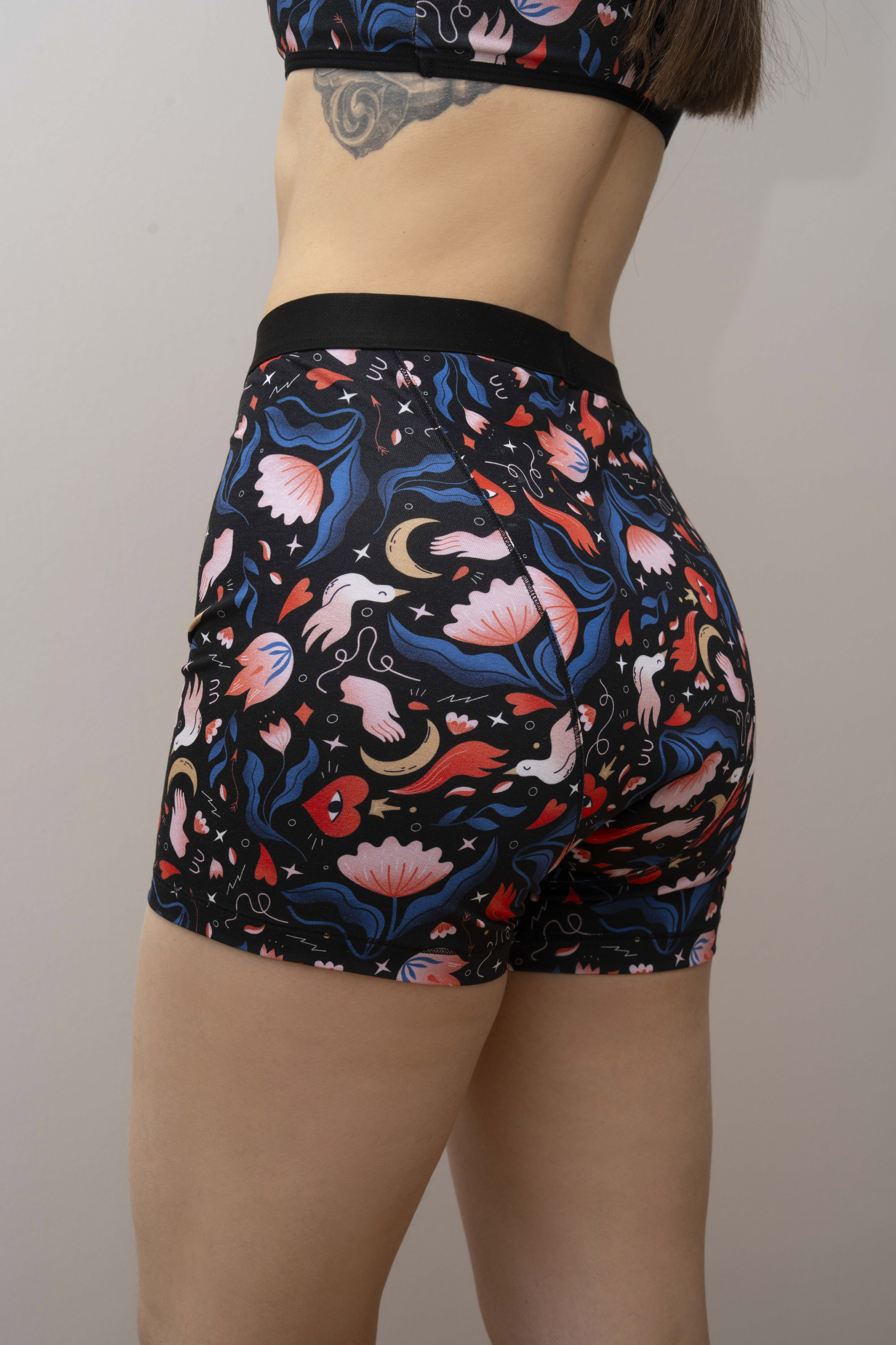 Трусы на высокой посадке в шорме шорт с высокой ластовицей с обеих сторон. Комфортная посадка и яркий авторский принт, который делает даже самые сложные дни приятнее.